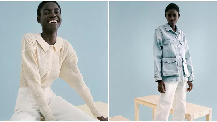 Στα κομμάτια της capsule συλλογής "Totême x Mytheresa" συναντάμε ένα σετ μπεζ πλισέ co-ord, φούστα και φόρεμα από ανακυκλωμένο πολυεστέρα, ένα barrel-shaped denim παντελόνι, ένα λευκό λινό φόρεμα με puff sleeves, ένα denim jacket και μια baby blue oversized ζακέτα.