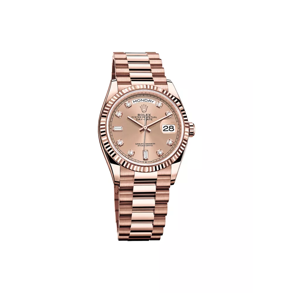 Ρολόι «Day-Date 36» της Rolex, από Everose χρυσό 18K, με διαμάντια και αυτονομία 70 ωρών, Rolex Hellas.