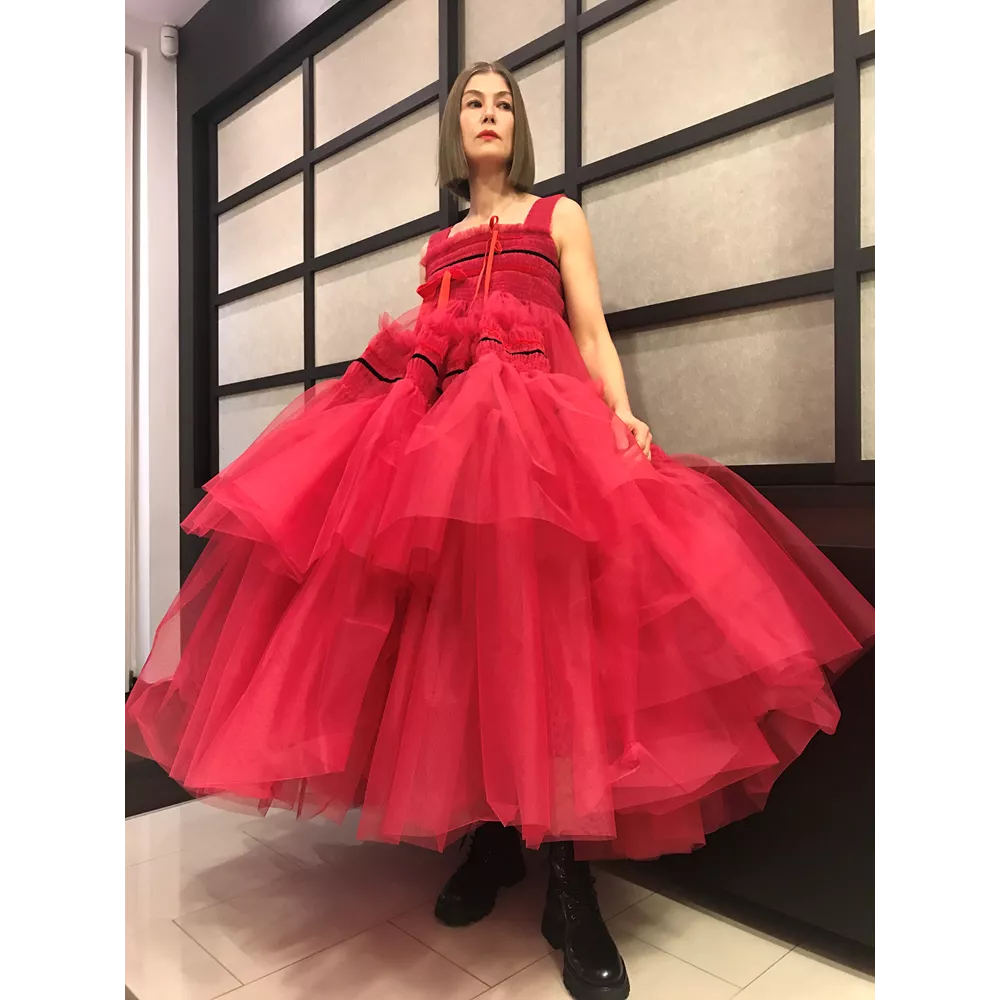 H Rosamund Pike με Molly Goddard φόρεμα και combat boots Alexander McQueen.