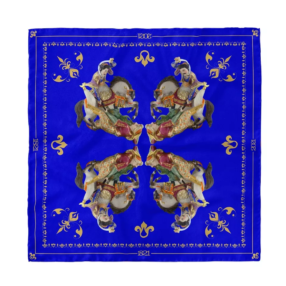 Μεταξωτό μαντήλι «Έλληνας και Τούρκος σε μάχη», εμπνευσμένο από την έκθεση «Αρχαιολατρεία και Φιλελληνισμός. Συλλογή Θανάση και Μαρίνας Μαρτίνου», Μουσείο Κυκλαδικής Τέχνης, Cycladic Shop.