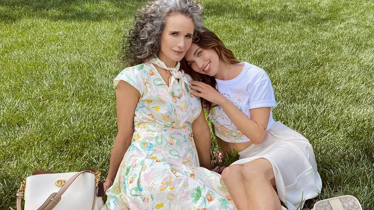 Τα εμπριμέ φορέματα είναι μια εξαιρετικά θηλυκή επιλογή, που δεν γνωρίζει ηλικιακούς περιορισμούς. Και η πρόσφατη εμφάνιση της 63χρονης Andie MacDowell το αποδεικνύει περίτρανα. Η διάσημη ηθοποιός, και πρώην μοντέλο, ποζάρει μαζί με την κόρη της Rainey για την καμπάνια της Coach που είναι αφιερωμένη στη Γιορτή της Μητέρας και φοράει ένα εμπριμέ μίντι πλισέ φόρεμα με tie neck από την ανοιξιάτικη συλλογή του brand. Τα kitten heel σανδάλια της ανήκουν επίσης στη συλλογή του brand, ενώ η δερμάτινη bucket bag της είναι επίσης Coach.