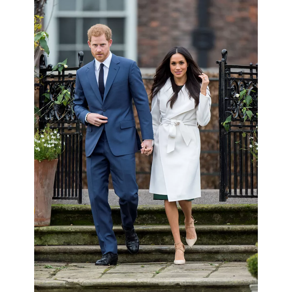Στην ανακοίνωση του αρραβώνα τους η Meghan φόρεσε ένα λευκό παλτό με έντονες γραμμές από το brand Line The Label.