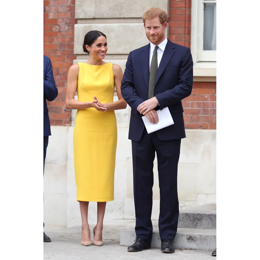 Η Meghan δεν φοβάται τα χρώματα, αντιθέτως τα λατρεύει. Για αυτό και επέλεξε το εν λόγω midi κίτρινο φόρεμα του Αμερικανού σχεδιαστή Brandon Maxwell.