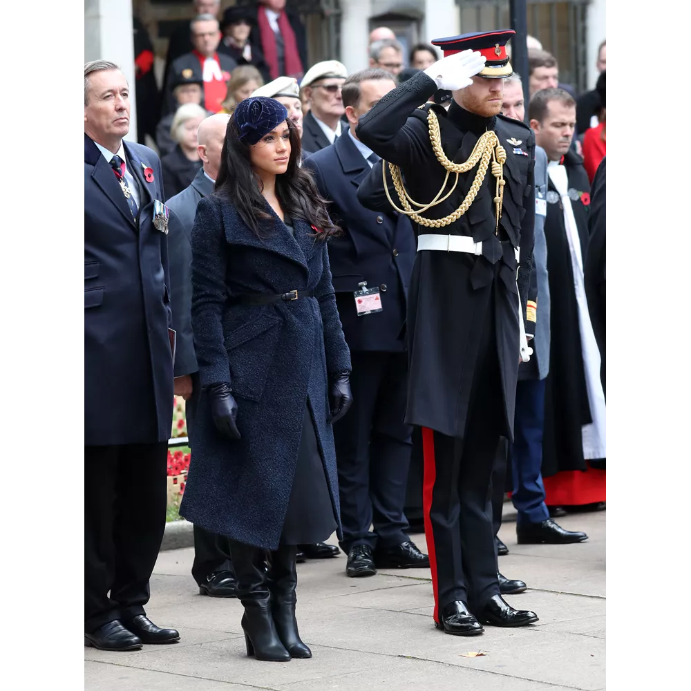 Η Meghan όταν παρευρέθηκε στην εκδήλωση μνήμης για τους πεσόντες του Α΄ Παγκοσμίου πολέμου δημιούργησε μία απολύτως κομψή εμφάνιση με παλτό Philip Treacy και μπότες Tamara Mellon.