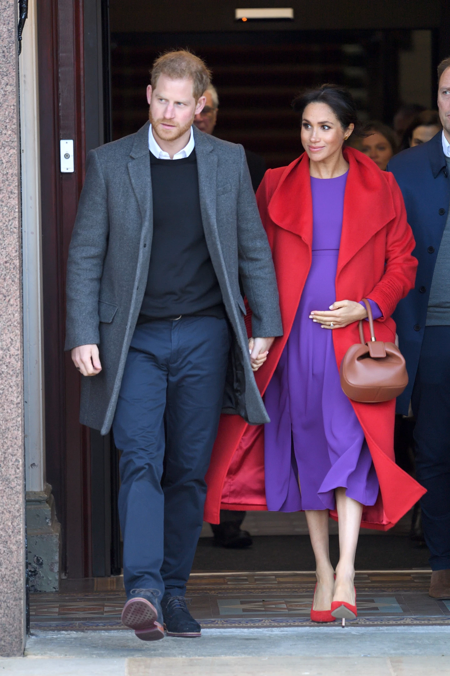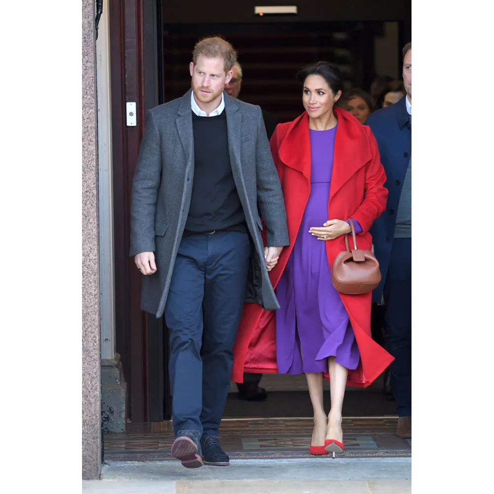 Σε επίσημη εμφάνιση τους στη Αγγλία η Meghan επέλεξε ένα μωβ φόρεμα Aritizia, κόκκινο παλτό Sentaler και καφέ τσάντα Gabriela Hearst.