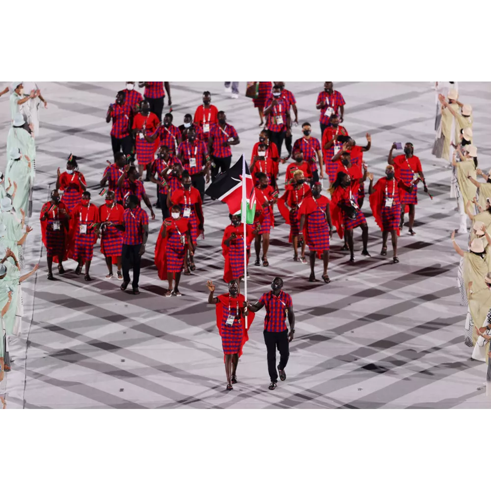 Οι αθλητές της Κένυας με μια στολή που αποτυπώνει ένα παροδοσιακό μοτίβο της φυλής των Μασσάι.