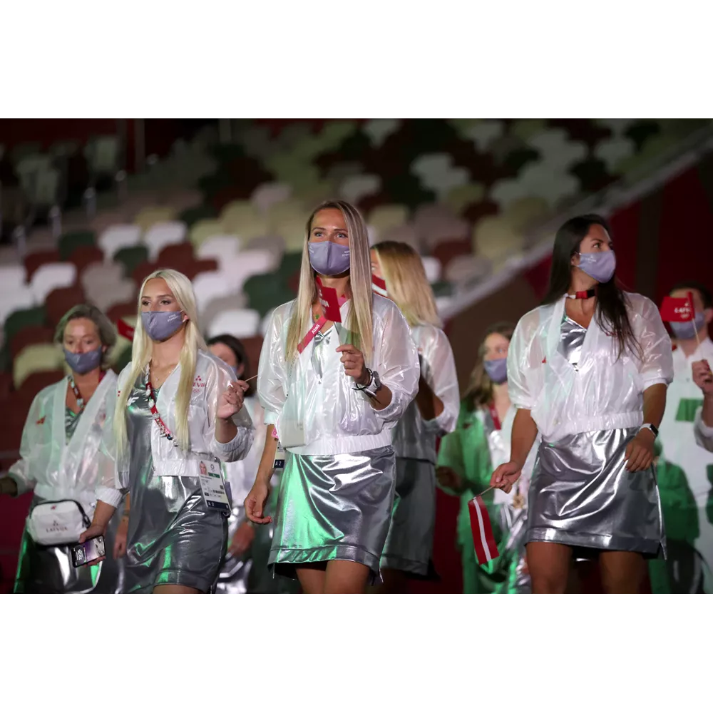 Οι αθλήτριες της Λετονίας με ασημί metallic φορέματα και διαφανή bomber jackets.