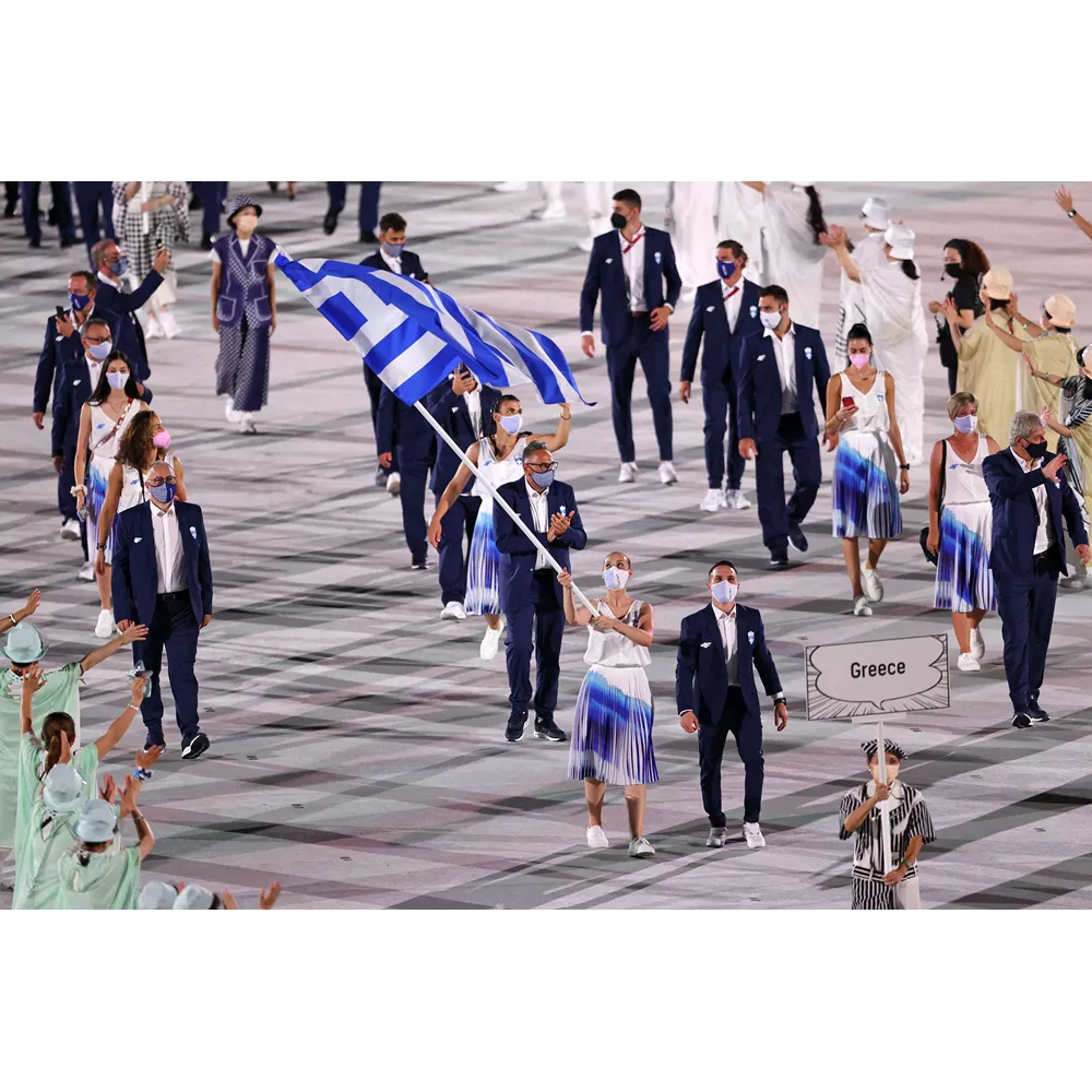 Η αποστολή με τους Έλληνες αθλητές μπαίνει στο Ολυμπιακό Στάδιο πρώτη. Τις στολές τους στις αποχρώσεις της γαλανόλευκης επιμελήθηκε η εταιρεία αθλητικών ειδών 4F.
