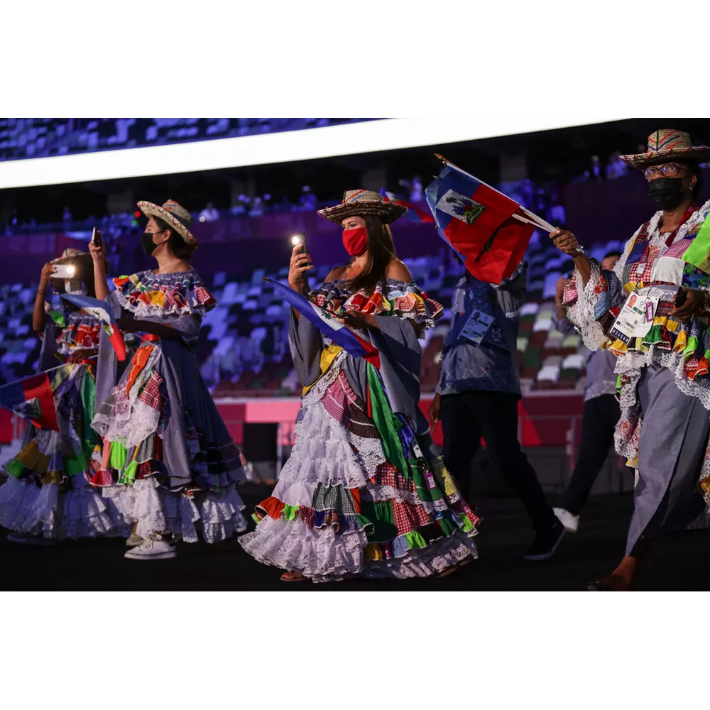 Οι αθλήτριες της Αϊτής με εντυπωσιακά patchwork φορέματα με βολάν και ψάθινα καπέλα.