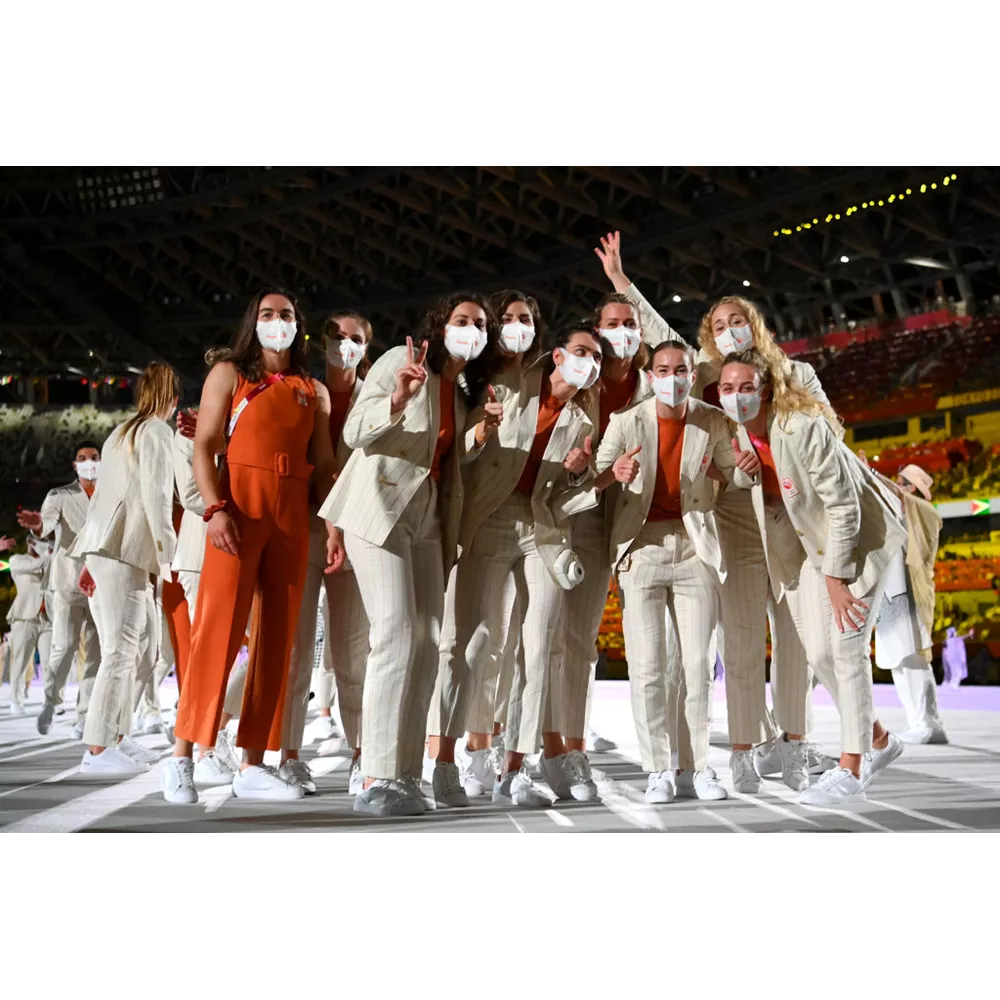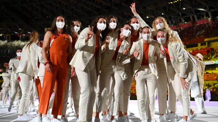Οι αθλήτριες της Ολλανδίας με κομψά ριγέ κοστούμια και ολόσωμες φόρμες σε πορτοκαλί χρώμα, το χρώμα που είναι άμεσα συνδεδεμένο με την παράδοσή τους - και τη βασιλική οικογένεια της χώρας τους.