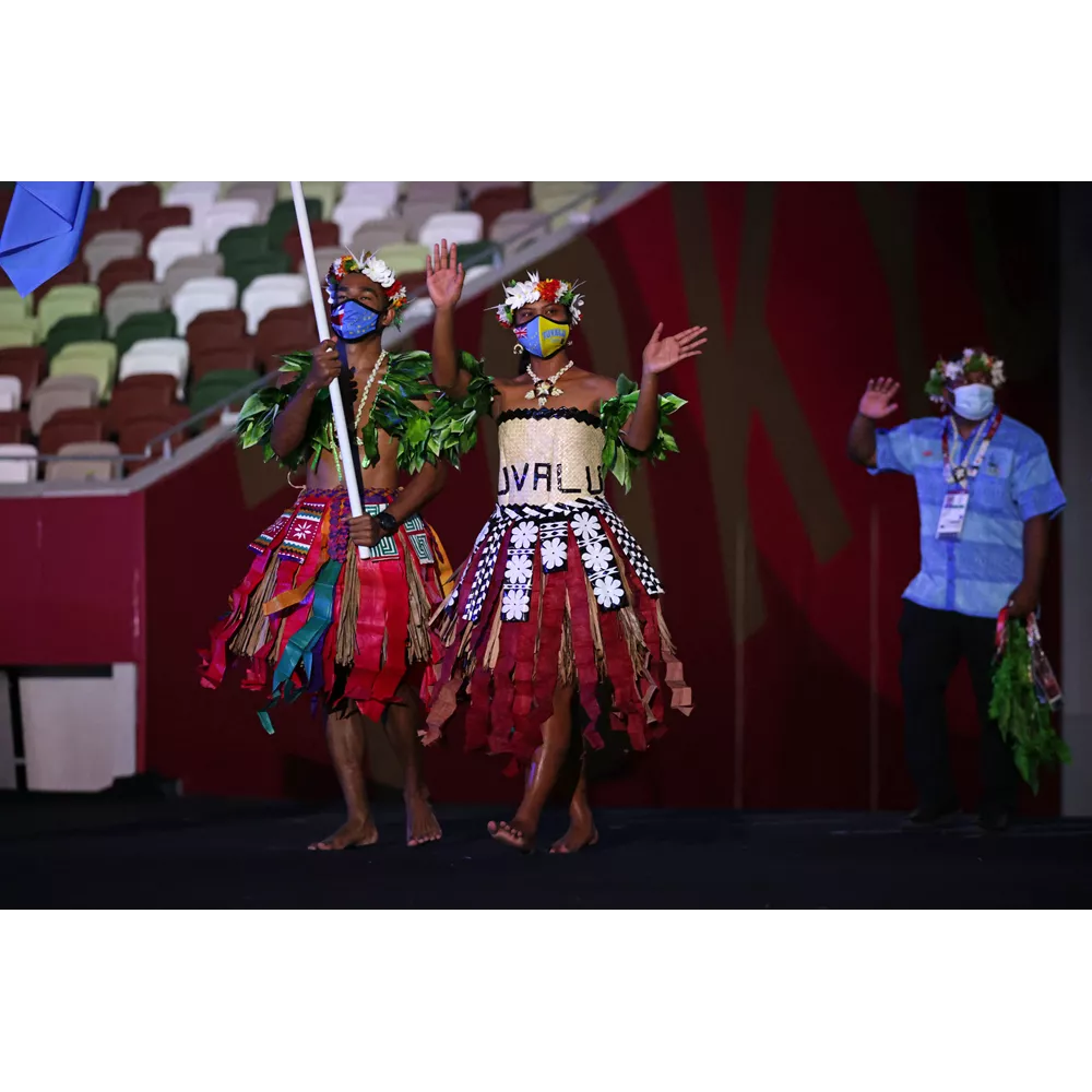 Οι σημαιοφόροι του Τουβαλού με παρασοδιακές Πολυνησιακές φορεσιές.