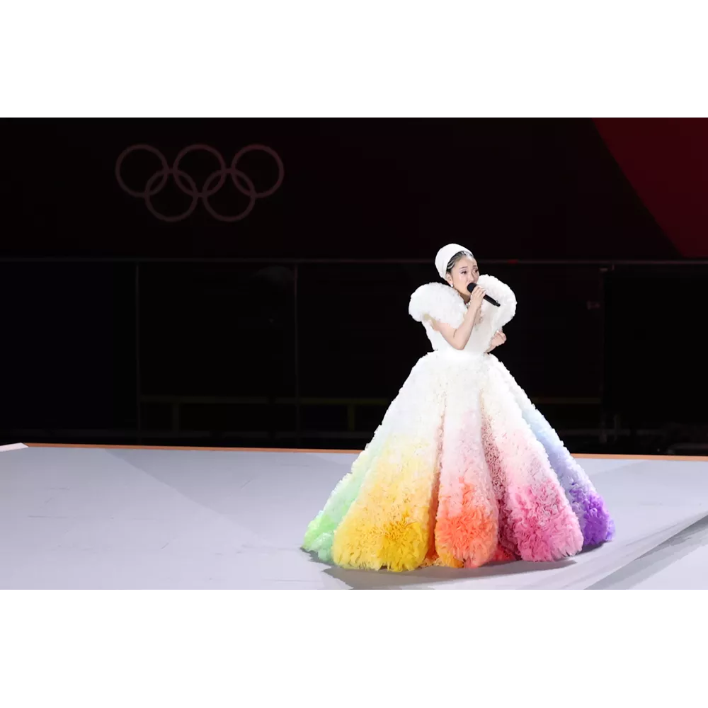 H Misia με την πολύχρωμη, ογκώδη δημιουργία από τούλι του Tomo Koizumi.