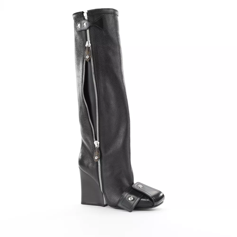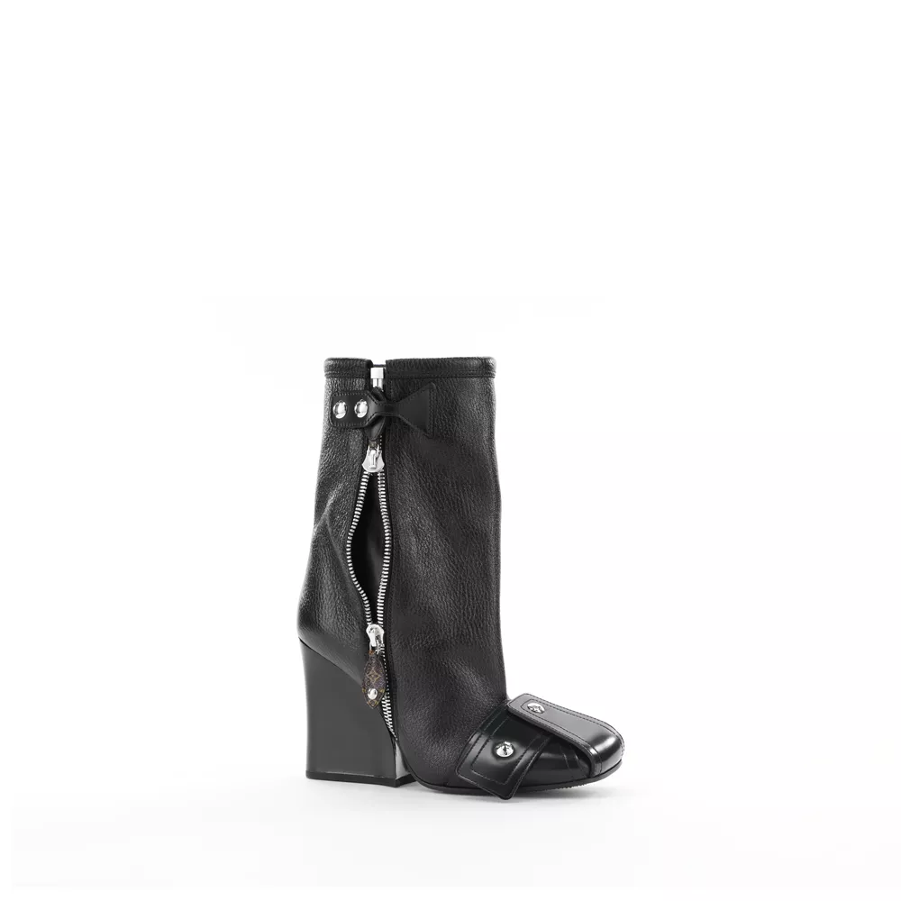 Το ζευγάρι παπούτσια που ξεχωρίζει από τη FW21 συλλογή είναι οι "Patti" μπότες, που εμπνέονται από τα biker jackets. Με αμφίδρομο φερμουάρ, μεταλλικά καρφάκια σκαλισμένα με το λογότυπο Louis Vuitton και διπλωμένα λουράκια στη μύτη, οι "Patti" κυκλοφορούν σε δυο εκδοχές, σε ankle boot και ψηλή μπότα, είτε σε all-black ή σε συνδυασμό έντονων χρωμάτων. Αυτή η εντυπωσιακή wedge boot που συνδυάζει punk και chic αισθητική γίνεται η αναμφίβολα η επιλογή για τα πιο τολμηρά looks της σεζόν.