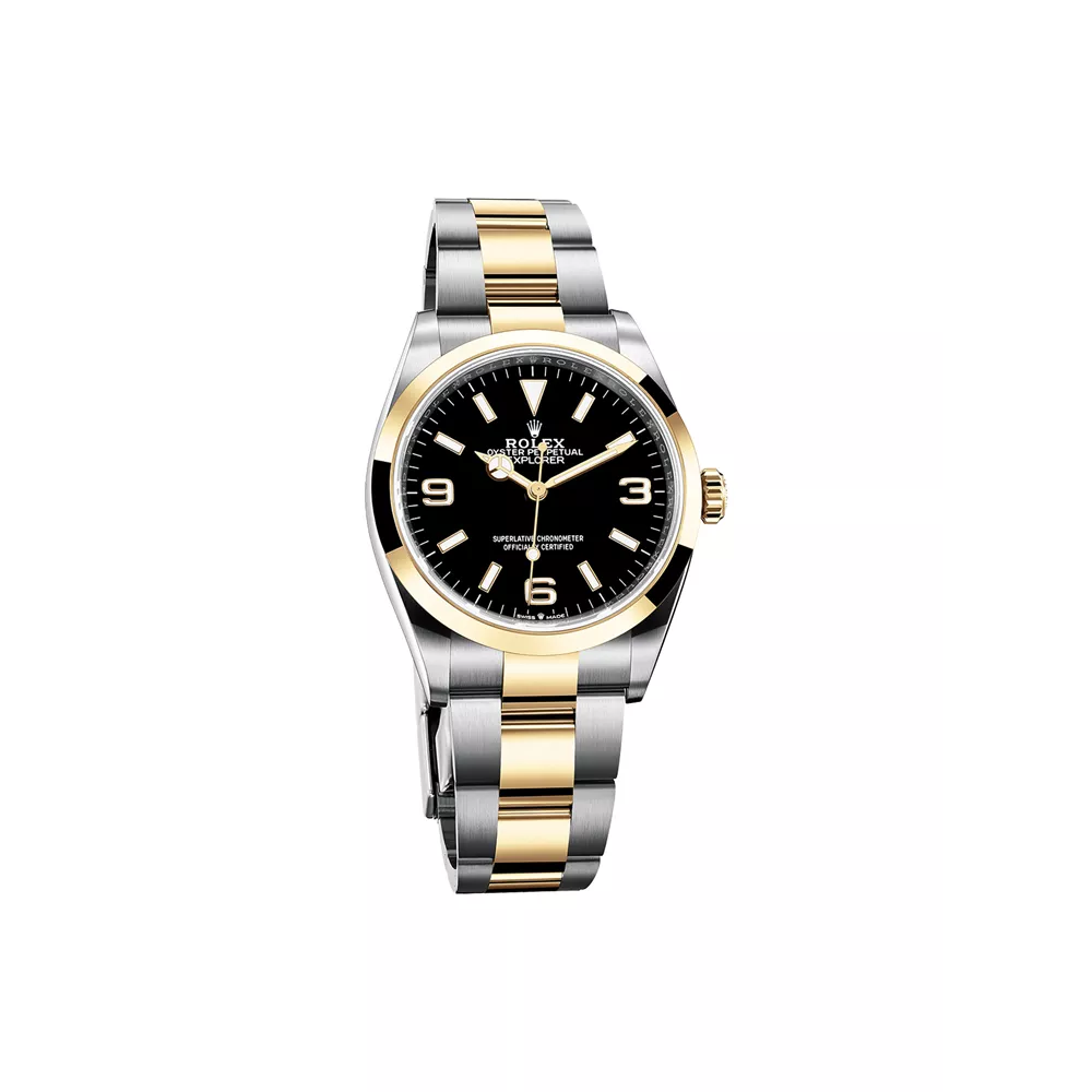 Ρολόι «Explorer» της Rolex, από κίτρινο χρυσό και ατσάλι, διαμέτρου 39 mm, με αυτονομία 70 ωρών, Rolex Hellas.