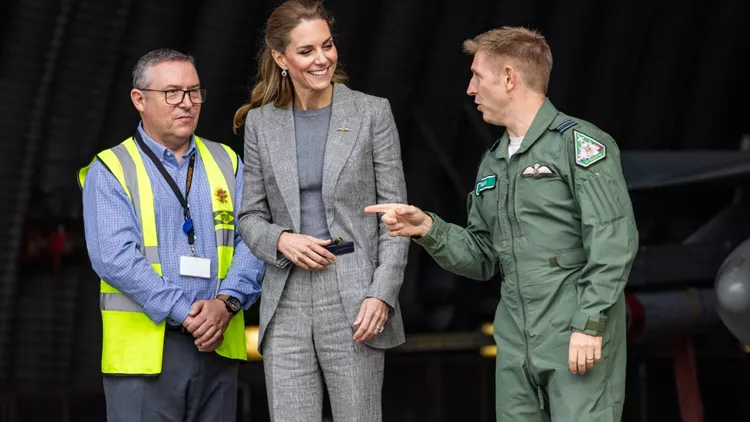 Μια επίσκεψη στο Royal Air Force Coningsby στο Lincolnshire του Ηνωμένου Βασιλείου πραγματοποίησε πρόσφατα η πριγκίπισσα της Ουαλίας, Kate Middleton, κατά τη διάρκεια της οποίας ξεναγήθηκε στις στρατιωτικές εγκαταστάσεις του και συνομίλησε κόσμο που εργάζεται σε αυτές. Για τις ανάγκες αυτής της εμφάνισης, η ίδια επέλεξε ένα διαχρονικό σύνολο βασισμένο σε γκρι κοστούμι, με τη designer που εκείνη εμπιστεύθηκε να είναι μάλιστα απόγονος του σπουδαίου Sigmund Freud.