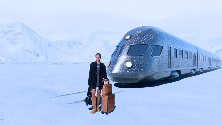 Στο περιστρεφόμενο βαγόνι-εστιατόριο, οι επιβάτες απολαμβάνουν ένα δείπνο που αψηφά τη βαρύτητα. Η δεξιοτεχνία της MCM πρωταγωνιστεί, καθώς οι εμβληματικές σιλουέτες του brand αιωρούνται σαν σύγχρονα γλυπτά. Στο κέντρο της σκηνής δεσπόζει η Aren Mini Bag, ένα σχέδιο-ορόσημο από το αρχείο της MCM, επανασχεδιασμένο για τη συλλογή Φθινόπωρο/Χειμώνας 2025 με πιο φρέσκια και σύγχρονη αισθητική.