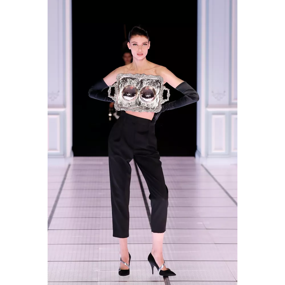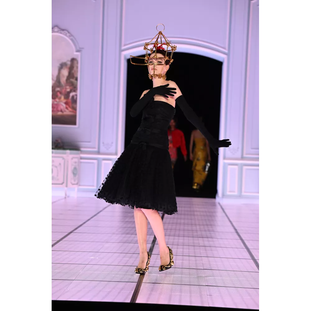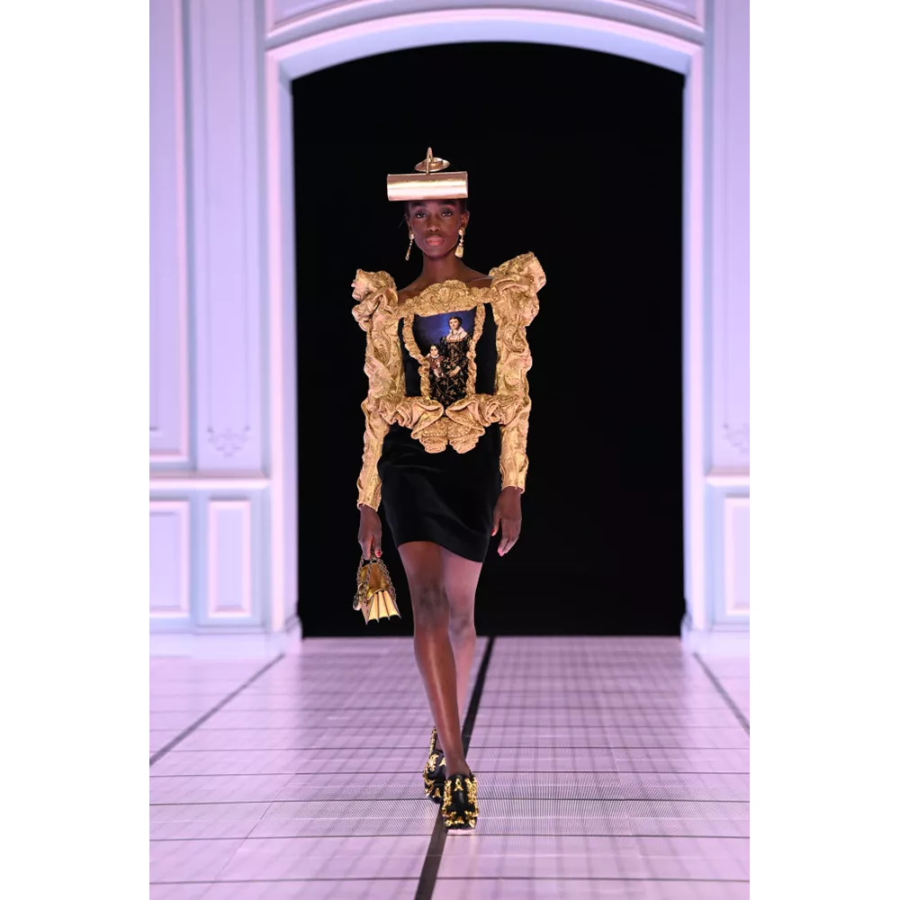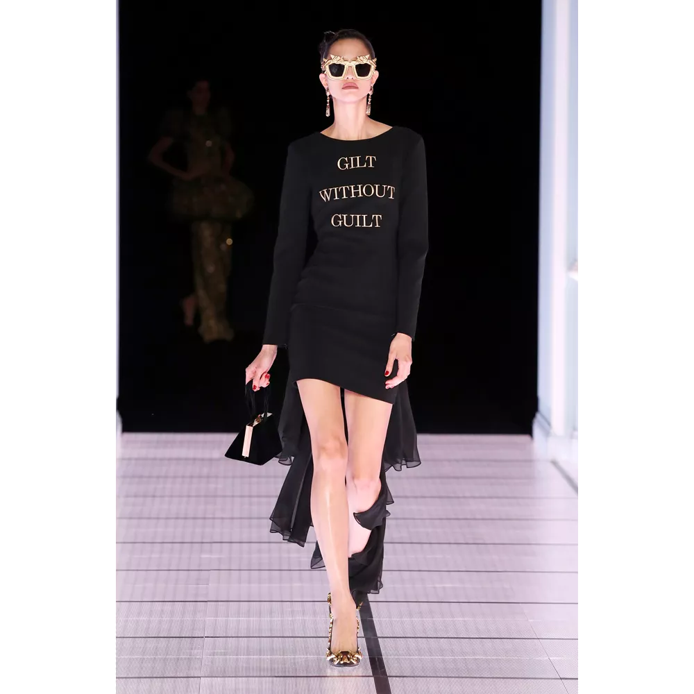 Το δράμα και η θεατρικότητα συνυπάρχουν με τον γνήσιο σουρεαλισμό στη συλλογή Moschino FW'22, που τιμά για μία ακόμα φορά την κληρονομία του- το σακάκι με τα μαχαιροπίρουνα, το μαύρο φόρεμα με το slogan "girl without guilt" αναβιώνουν αρχειακά κομμάτια, κι αν έχετε καμία αμφιβολία για το ποιος θα μπορούσε να εμπιστευτεί αυτή την υπερβολή στο ντύσιμό του, ιδίως μια συλλογή που αναφέρεται στο RTW, η απάντηση είναι ότι διανύουμε την εποχή που ο σουρεαλισμός αναβιώνει ξανά στη μόδα (βλ. Schiaparelli) και το στιλ αναζητά να εκφραστεί ξανά έντονα και μοναδικά - μέσα από τα επιμέρους κομμάτια, τα αξεσουάρ, το styling. Και ο Jeremy Scott με τον οίκο Moschino που ακολουθούν πιστά τη φιλοσοφία της χωρίς περιορισμούς δημιουργικής ελευθερίας, της υπερβολής που σ' αφήνει άναυδο, του πολύχρωμου εκκεντρισμού συμβαδίζουν απόλυτα με την εποχή.
