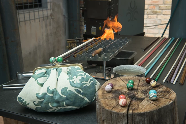 Το Modello Venezia της Pasticcino bag είναι φτιαγμένο από πολυτελή υφάσματα Fortuny και πολύχρωμες γυάλινες μπάλες που διακοσμούν το χαρακτηριστικό στρογγυλό κούμπωμα της και είναι κατασκευασμένες από γυαλί Murano.