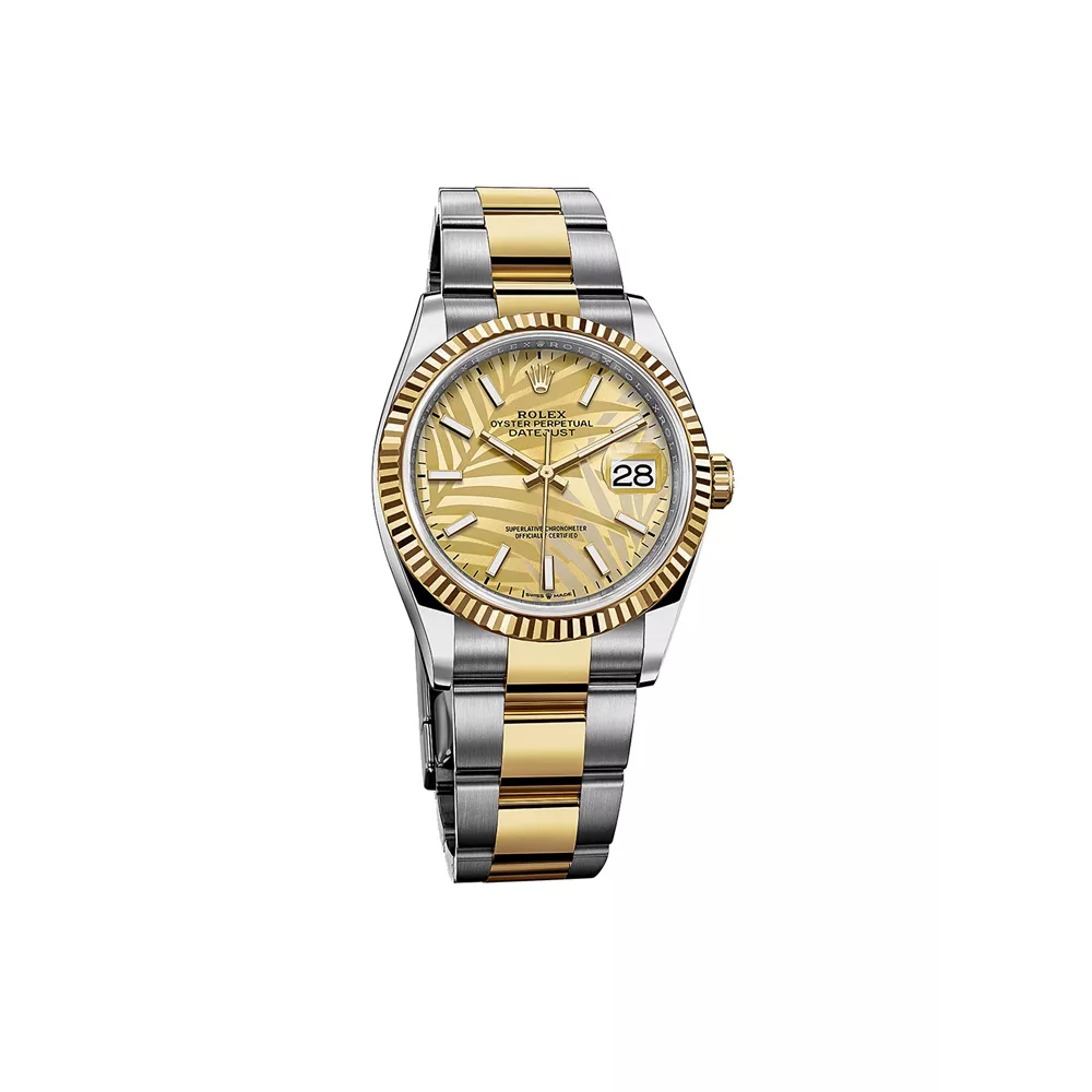 Ρολόι «Datejust 36» της Rolex, από κίτρινο χρυσό 18Κ και ατσάλι, διαμέτρου 36 mm, με καντράν με μοτίβο φοίνικα, αυτόματο, με αυτονομία 70 ωρών, Rolex Hellas.