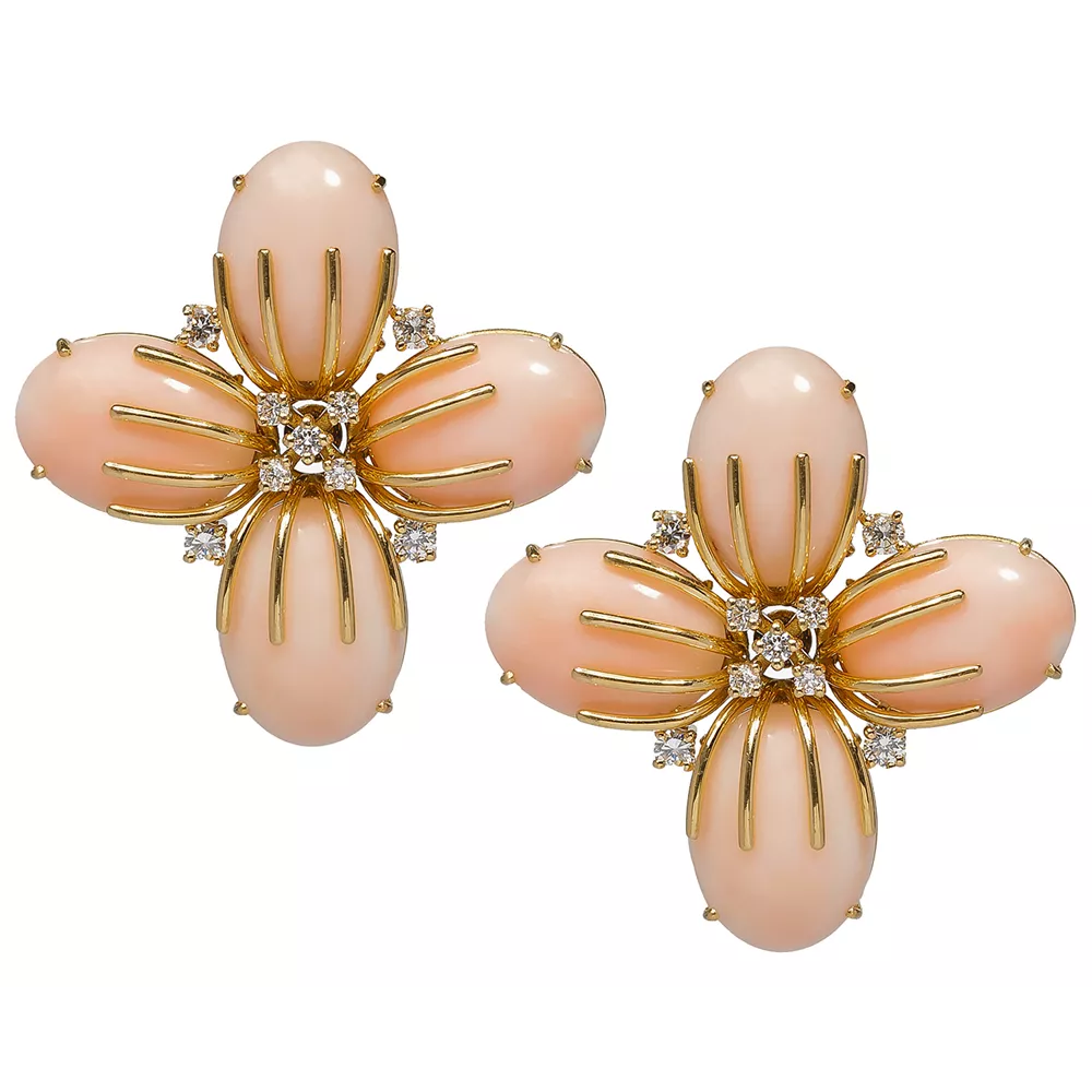 Χρυσά σκουλαρίκια 18Κ με Angel Skin Coral και διαμάντια, Vourakis.