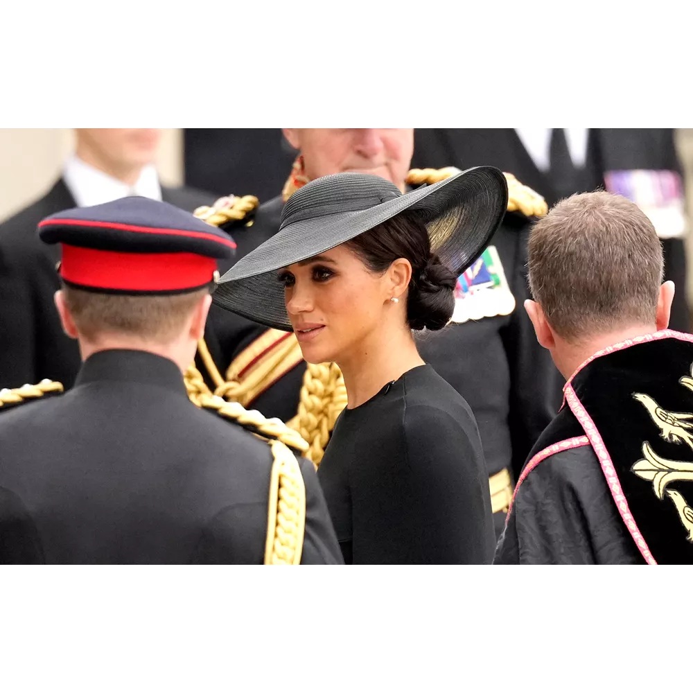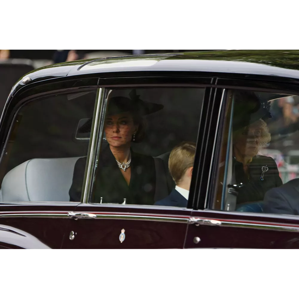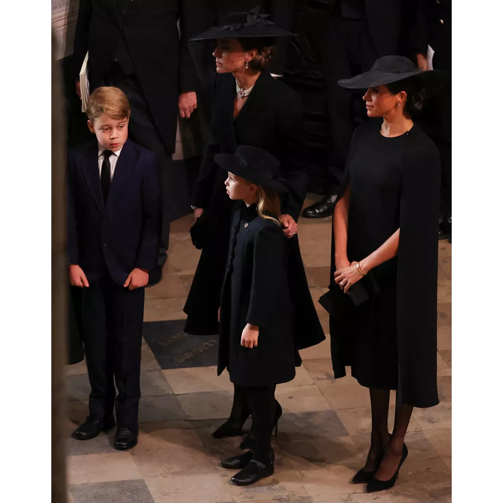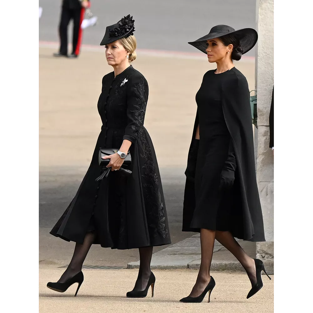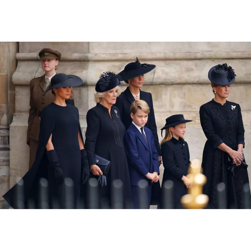 Τον πρώτο λόγο, βεβαίως, στις πένθιμες εμφανίσεις είχαν οι ισχυρές Κυρίες της βασιλικής οικογένειας οι οποίες φρόντισαν να τιμήσουν τη βασίλισσα φορώντας κοσμήματα με συμβολισμούς. Η Kate Middleton εμπιστεύτηκε για μία ακόμα φορά τον αγαπημένο της οίκο Alexander McQueen για το look της επενδύοντας σ' ένα κομψό coatdress που συνδύασε με καπέλο Philip Treacy και κοσμήματα (μαργαριταρένια σκουλαρίκια και κολιέ) που είχε φορέσει και στην κηδεία του Πρίγκιπα Φιλίππου, και ανήκαν στη Βασίλισσα Ελισάβετ. Ιδιαίτερα κομψή εμφανίστηκε και η Meghan Markle μ' ένα cape dress της Stella McCartney, καπέλο του Stephen Jones για τον οίκο Dior και σκουλαρίκια με πέρλες που της είχε κάνει δώρο η Βασίλισσα το 2018. Όσο για την εκκολαπτόμενη royal fashionista, την 7χρονη Πριγκίπισσα Charlotte, η μητέρα της Πριγκίπισσα Kate την έντυσε στα μαύρα για την περίσταση, παρά την παιδική της ηλικίας, επενδύοντας σ' ένα παλτό από το παιδικό brand Ancar, δερμάτινες Mary Janes και καπέλο από το Jane Taylor London. Η μικρή Πριγκίπισσα φορούσε επίσης στο πέτο της μία καρφίτσα που είχε το σχήμα από πέταλο αλόγου, ως φόρο τιμής στην αγάπη της προγιαγιά της στα άλογα (ήταν, μάλιστα, ένα δώρο που της είχε κάνει εκείνη).