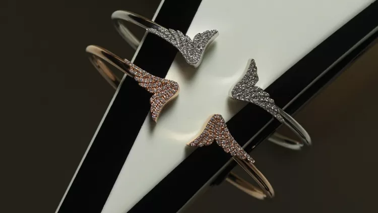 Από λευκόχρυσο ή ροζ χρυσό 18 καρατίων σε διάφορα μεγέθη, ντυμένα με σμάλτο ή πολύτιμες πέτρες και με τη δυνατότητα σχεδιασμού σε διάφορα χρώματα και πέτρες μέσω της υπηρεσίας customization, τα βραχιόλια της σειράς Wing Bangles έρχονται σαν ένα αρχετυπικό φυλακτό για να ακουμπήσουν δύο λεπτοδουλεμένα φτερά πάνω στον καρπό, τιμώντας έτσι και προστατεύοντας ταυτόχρονα το δικαίωμά στην απόλυτη αξία της ελεύθερης βούλησης.