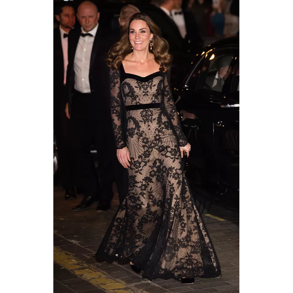 Τα φορέματα με δαντέλα επίσης είναι ιδανική επιλογή για τις εορτασικές εμφανίσεις την περίοδο των Χριστουγέννων. Η Kate Middleton φόρεσε ένα Alexander McQueen φόρεμα με δαντελένιες λεπτομέρειες στο Royal Variety Performance, το 2019.
