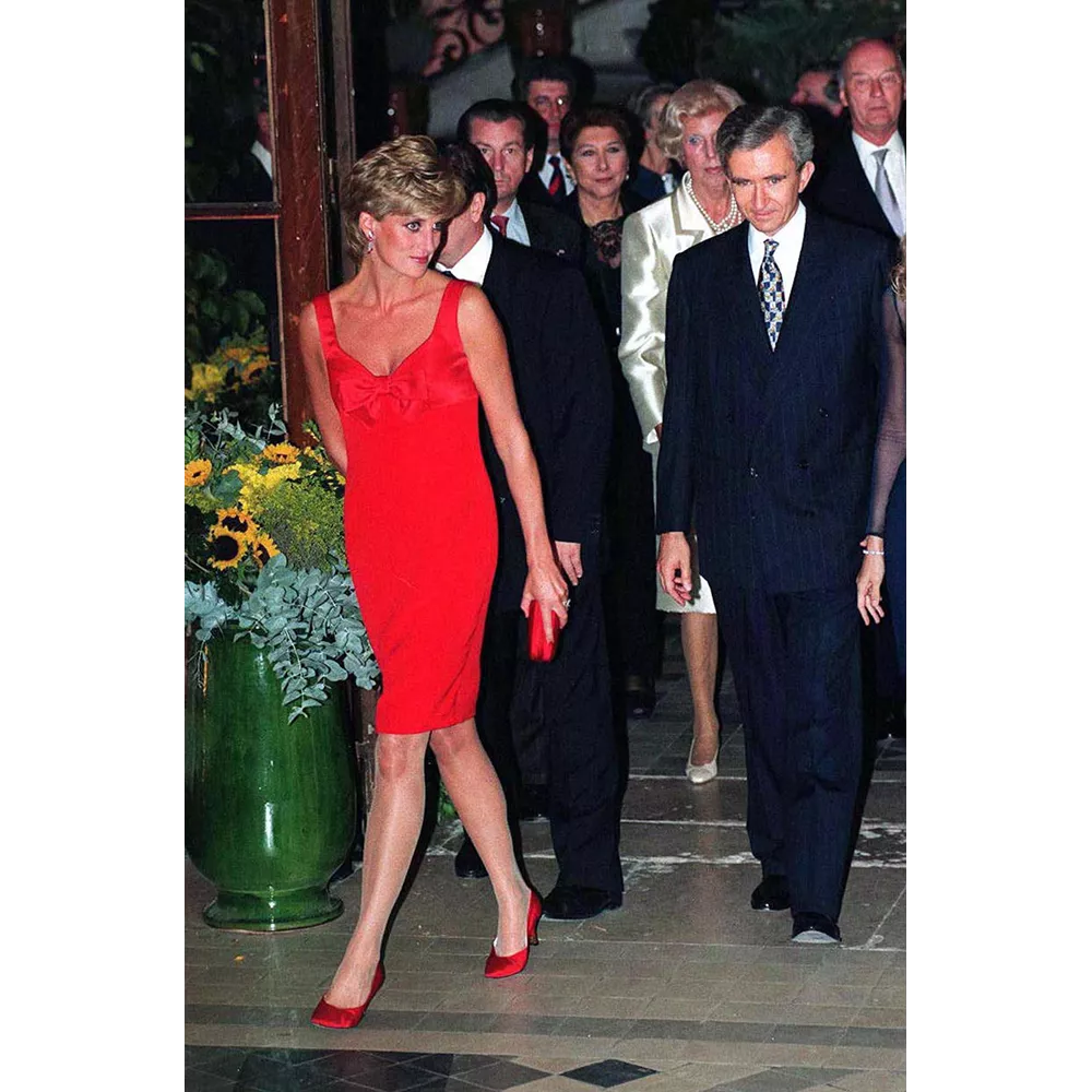 H πριγκίπισσα Diana για δείπνο στο Petit Palais στο Παρίσι το 1995. Φοράει φόρεμα του Christian Lacroix με κόκκινες σατέν γόβες και clutch.