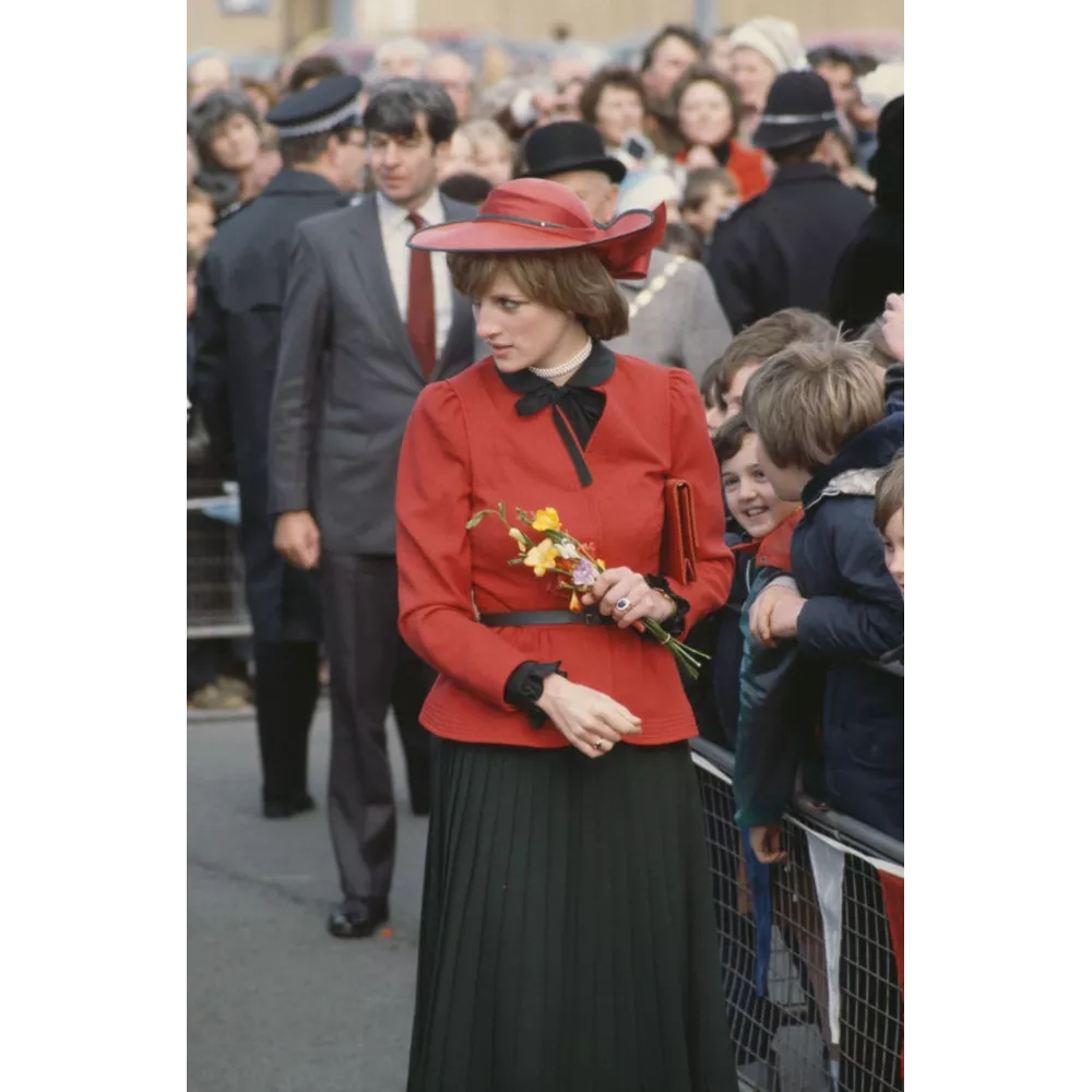 Σε περιοδεία στην Ουαλία το 1981. Η Diana φοράει κοστούμι με πλισέ φούστα του Donald Campbell και καπέλο John Boyd.