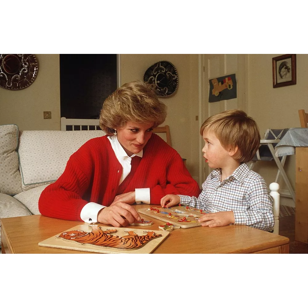 Φτιάχνοντας puzzle με τον πρίγκιπα William. Η Diana φοράει κόκκινη ζακέτα πάνω από λευκό πουκάμισο.