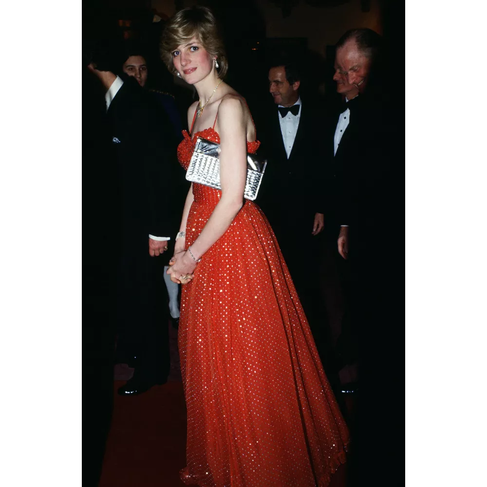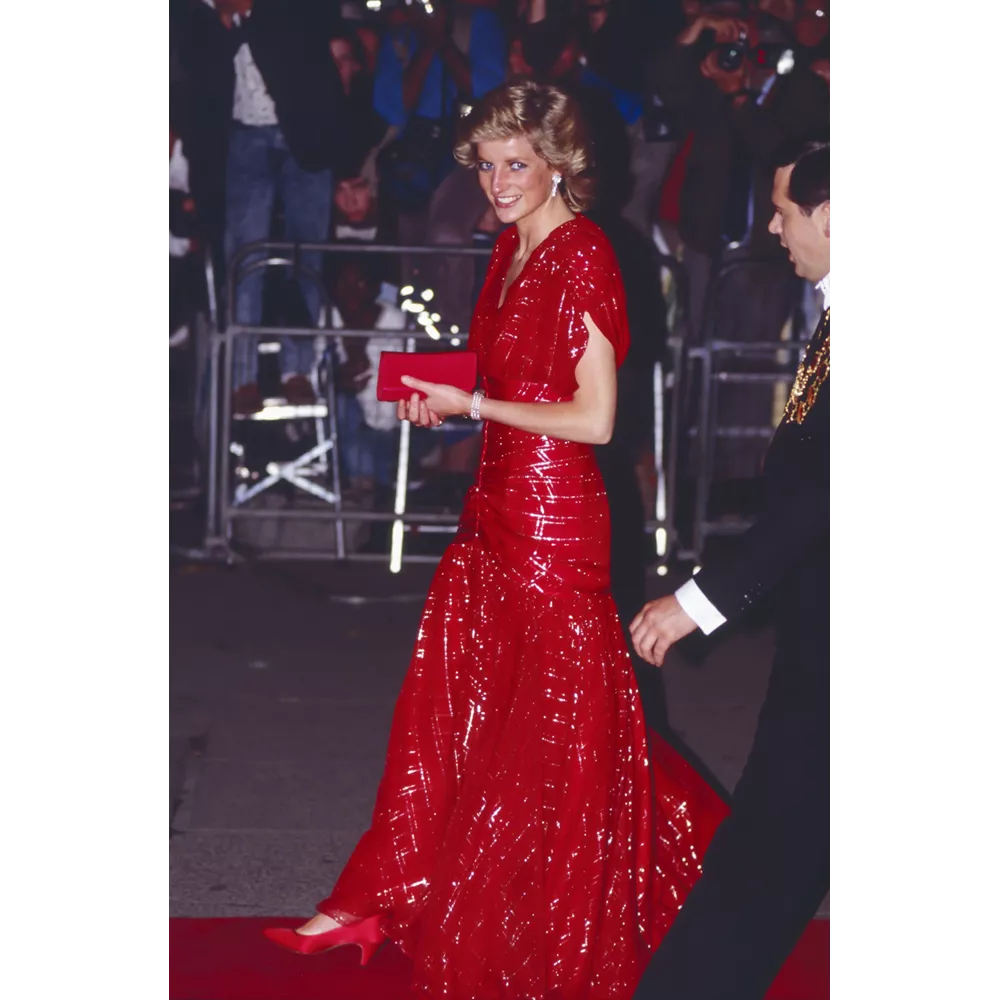 Το κόκκινο ήταν συχνά η επιλογή της και σε βραδινό ένδυμα, με το red silk μάξι φόρεμα με lamé tartan μοτίβο του σχεδιαστή Bruce Oldfield, όπως και το princess-like πουά τούλινο φόρεμα σε κόκκινο χρώμα του Bellville Sassoon, να θεωρούνται πλέον iconic εμφανίσεις. Μεταγενέστερα, και αφού έχει χωρίσει με τον Κάρολο, η Diana καταφεύγει σε πιο σέξι σιλουέτες με το μίνι μήκος, τις εφαρμοστές γραμμές και τα θηλυκά ντεκολτέ να γίνονται κυρίαρχα στο επίσημο ντύσιμό της. Η αγάπη της για το κόκκινο χρώμα, ωστόσο, δεν την εγκατέλειψε ποτέ και φορέματα όπως το κόκκινο cocktail dress του Christian Lacroix που φόρεσε στο Παρίσι το 1995 ή το αντίστοιχου στιλ δαντελένιο φόρεμα της αγαπημένης της σχεδιάστριας, Catherine Walker, που φόρεσε την ίδια χρονιά στο ταξίδι της στην Αργεντινή, επιβεβαιώνουν την σταθερή της προτίμηση στο χρώμα του πάθους, σε βραδινές αλλά και πρωινές περιστάσεις.