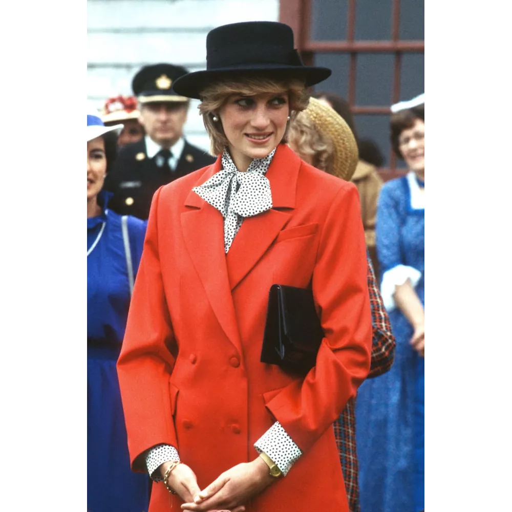 Σε ταξίδι της στον Καναδά το 1983. Φορούσε κόκκινο σακάκι με pussy - bow μπλούζα, μαύρο καπέλο και clutch.