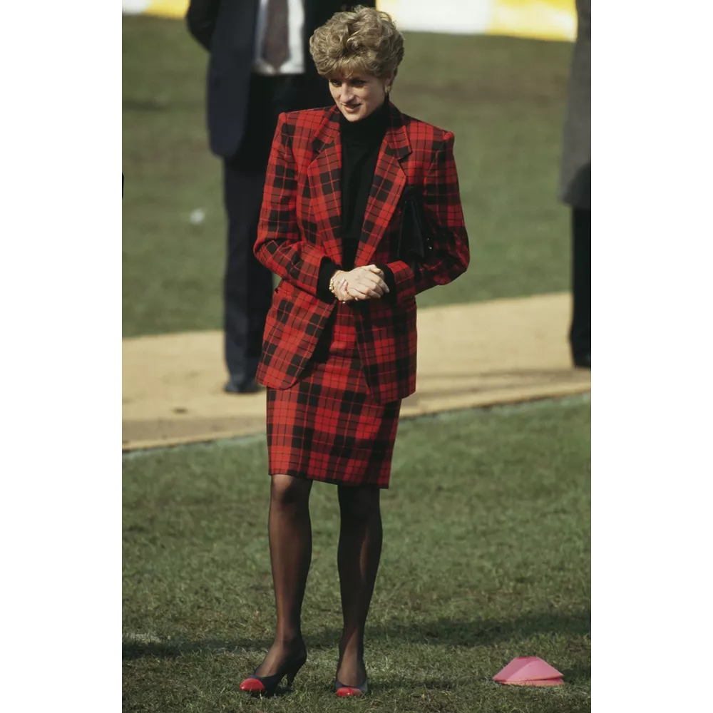 Η πριγκίπισσα Diana στο Σουόνσι της Ουαλίας το 1992 με κόκκινο - μαύρο tartan ταγέρ και two-tone γόβες.