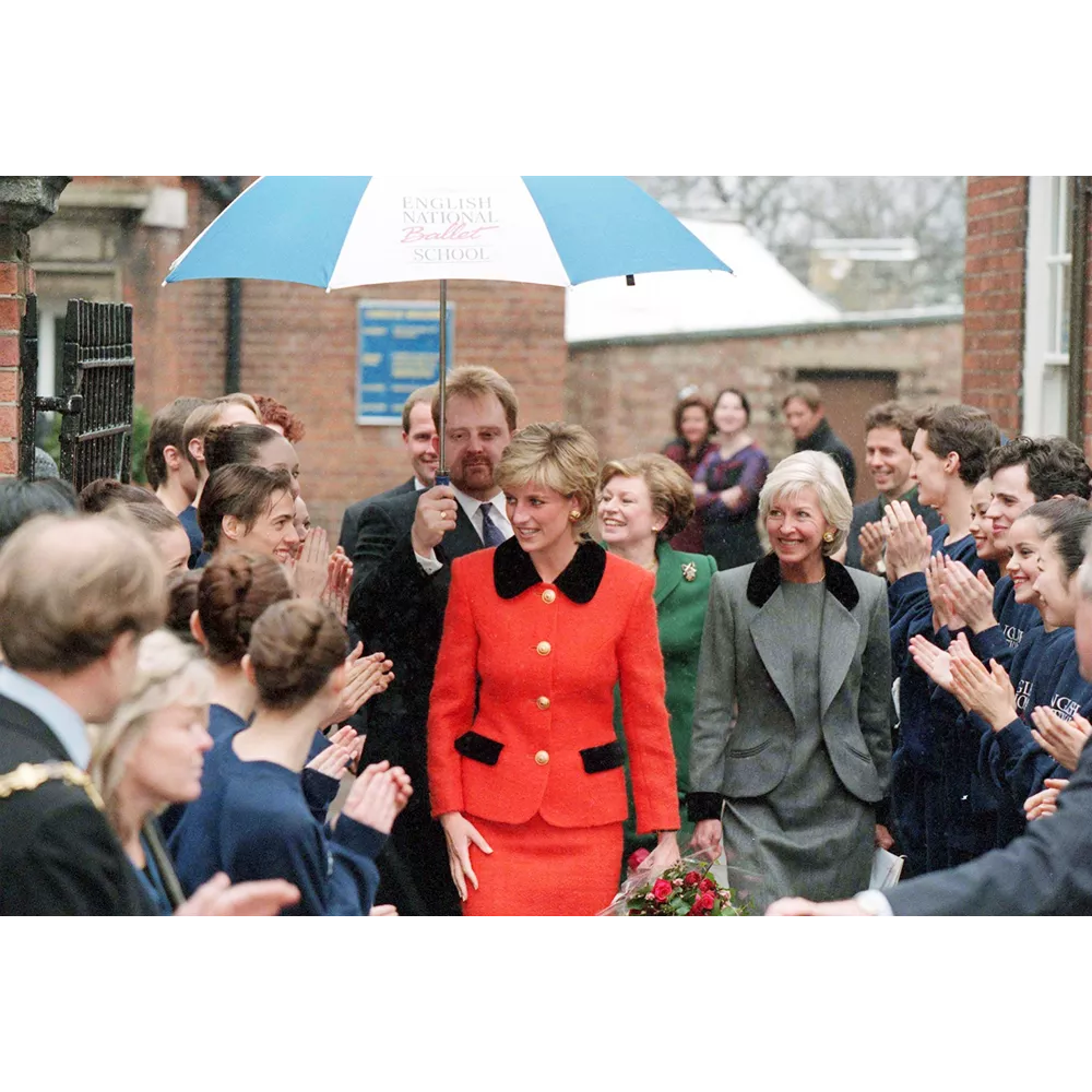 Σε επίσκεψή της στην σχολή μπαλέτου της Αγγλίας το 1995. Φοράει κόκκινο ταγέρ με μαύρο πέτο στο σακάκι και χρυσά κουμπιά.