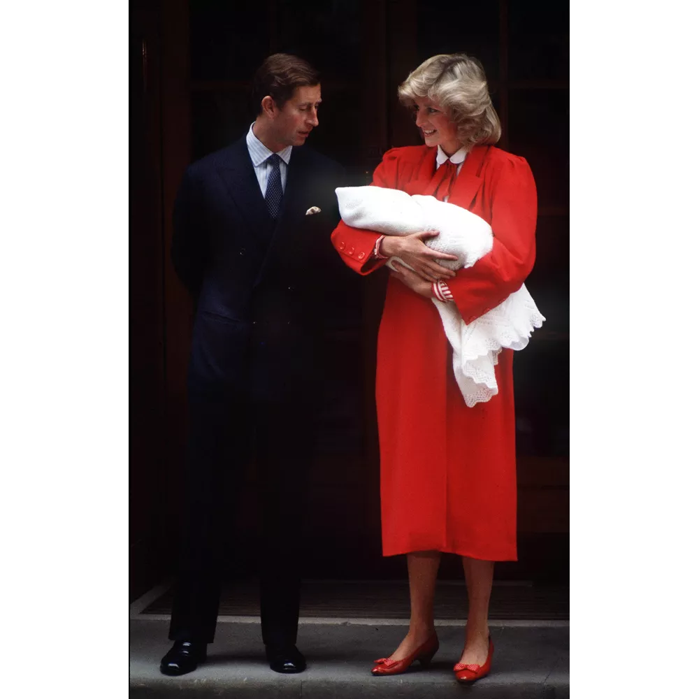 1984: Ο Κάρολος και η Diana αποχωρούν από το μαιευτήριο St Mary με τον νεογέννητο Harry. Η πριγκίπισσα φοράει κόκκινο παλτό του Jan van Velden και κόκκινες γόβες με φιόγκο.