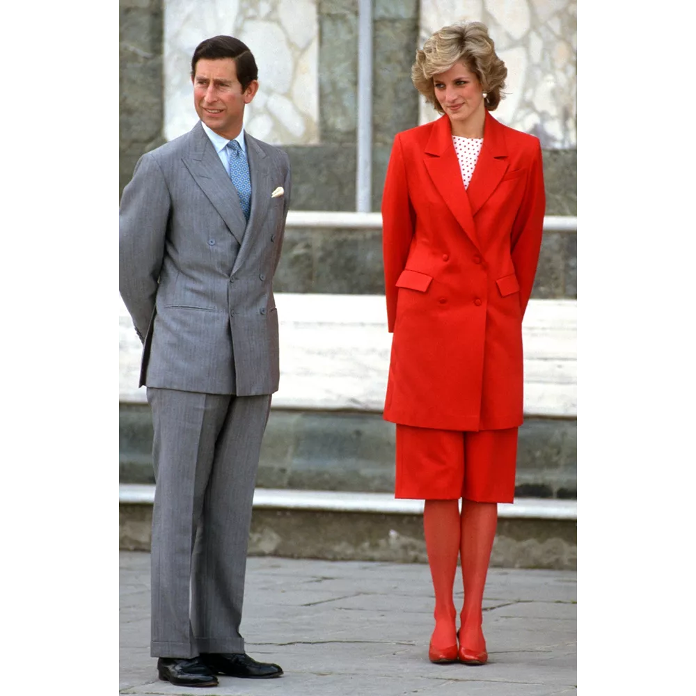 H Diana με τον Κάρολο στην Φλωρεντία το 1985. Το κόκκινο Japer Conran κοστούμι της είχε συνδυάσει με πουά τοπ, κόκκινι καλσόν και γόβες.
