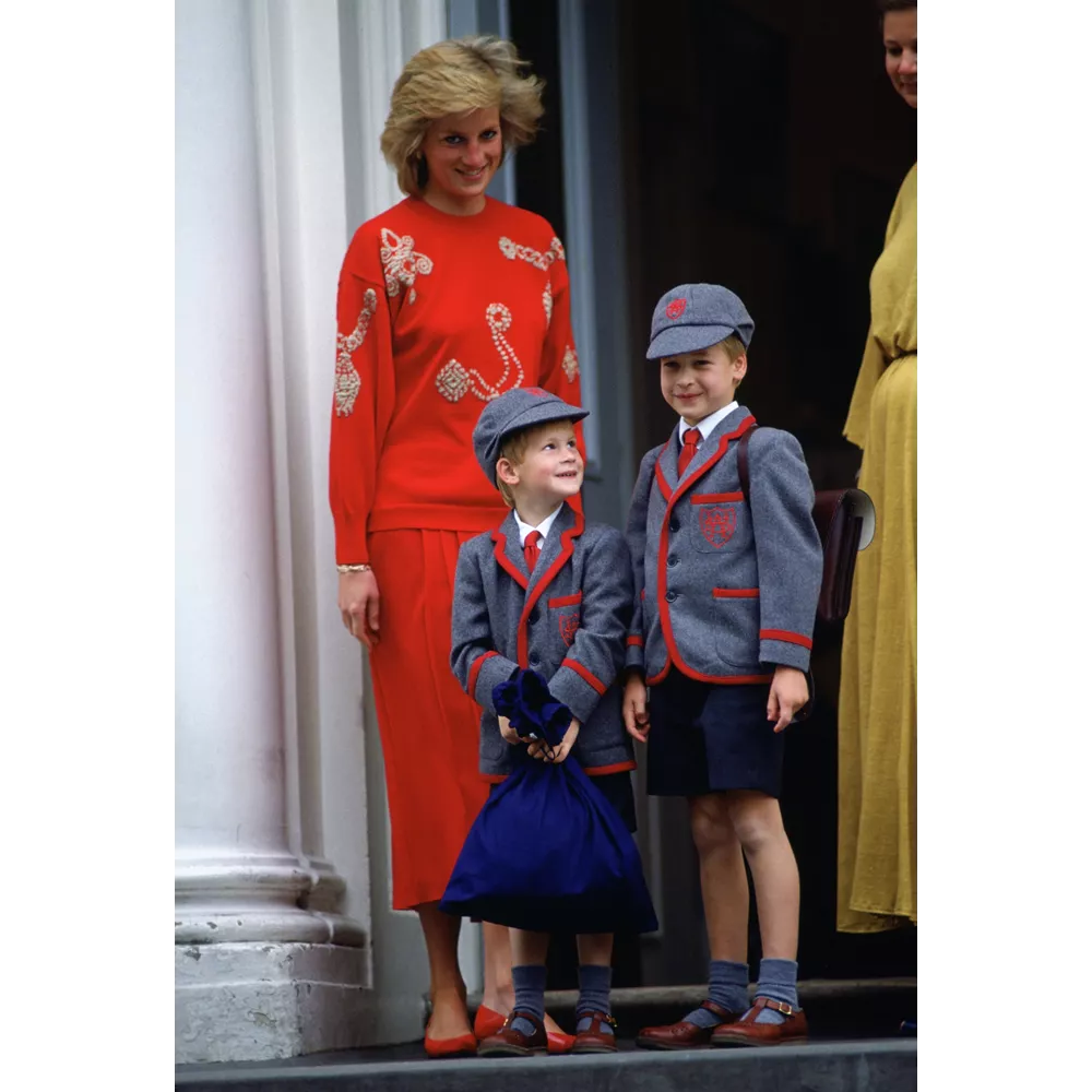 Με τους γιούς της William και Harry, στα σκαλιά του Wetherby School στην πρώτη μέρα του Harry στο σχολείο. Η Diana φοράει κόκκινο πουλόβερ, κόκκινη πλισέ φούστα και κόκκινες γόβες.