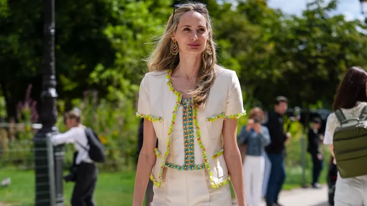 Αν θέλετε να φορέσετε ένα κοστούμι το καλοκαίρι, καν'τε το όπως οι Γαλλίδες: βρείτε το λιγότερο βαρετό σχέδιο, που ξεχωρίζει με την περίτεχνη διακόσμησή του, και φορέστε το με εντυπωσιακά σκουλαρίκια και κλασικές μπαλαρίνες.