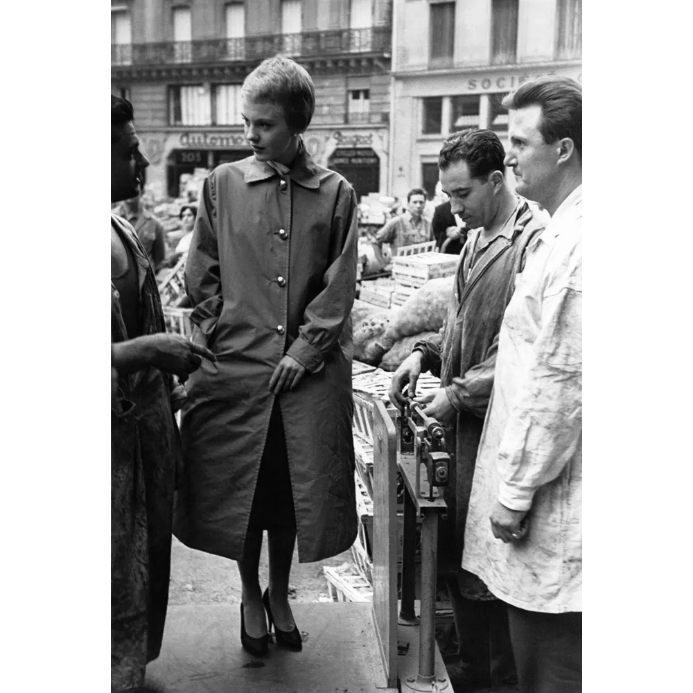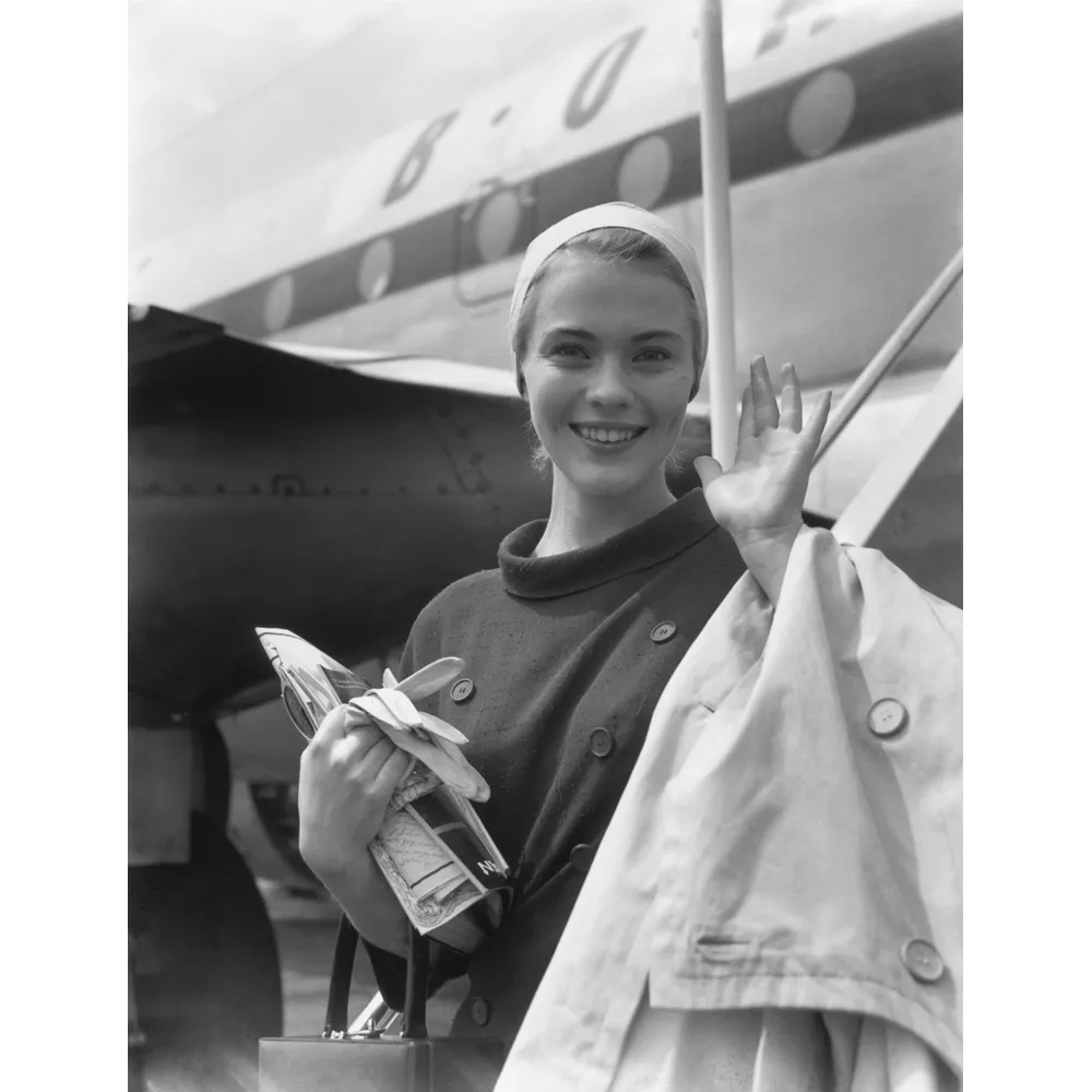 Ταξιδιωτικό στυλ: Η Seberg είχε συνδυάσει μαντήλι στο κεφάλι με κομψό πανωφόρι, το 1957/