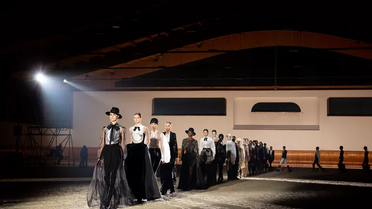 Τα μοντέλα περπάτησαν στους χώρους ιππικού ομίλου, σε κάποιες στιγμές συντροφιά με τα άλογά τους, ξεχωρίζοντας με την αριστοκρατική τους κομψότητα, όπως αυτή αποτυπώνεται μοναδικά στις δημιουργίες της Franchi. Σε μία εποχή που όλα είναι ρευστά κι όλα μεταλλάσσονται, ο ιταλικός οίκος επιλέγει να αναδείξει το στιλ των γυναικών που δεν φοβούνται και λειτουργούν με τόλμη στην καθημερινότητά τους, όπως οι αναβάτριες όταν ιππεύουν.