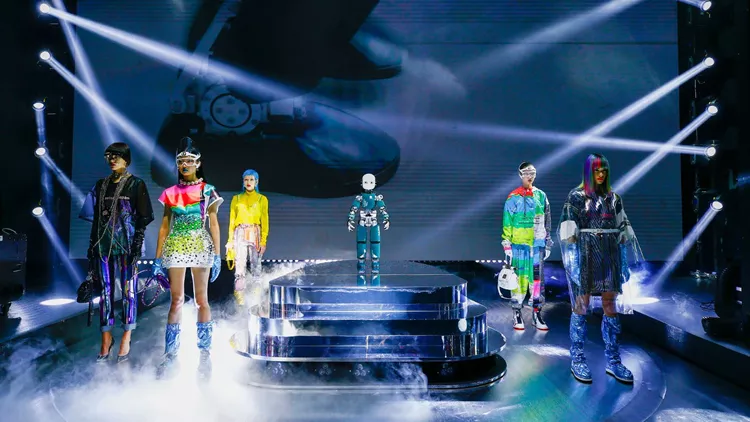 Οι μεταλλικές υφές σε ρούχα που εφαρμόζουν απόλυτα στο σώμα, με μακριά μανίκια, ψηλό λαιμό και ασορτί τσάντα, δίνουν στις γυναίκες που τα φορούν χαρακτηριστικά που παραπέμπουν στην υψηλή τεχνολογία, μετατρέποντάς τες σε αισθησιακά ρομπότ που φέρνουν σήμερα το μέλλον με όχημα τη μόδα.