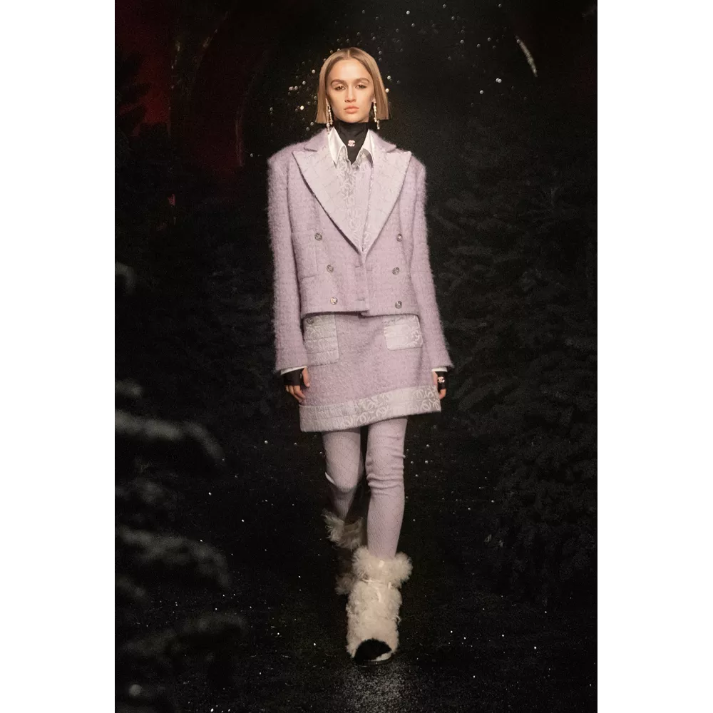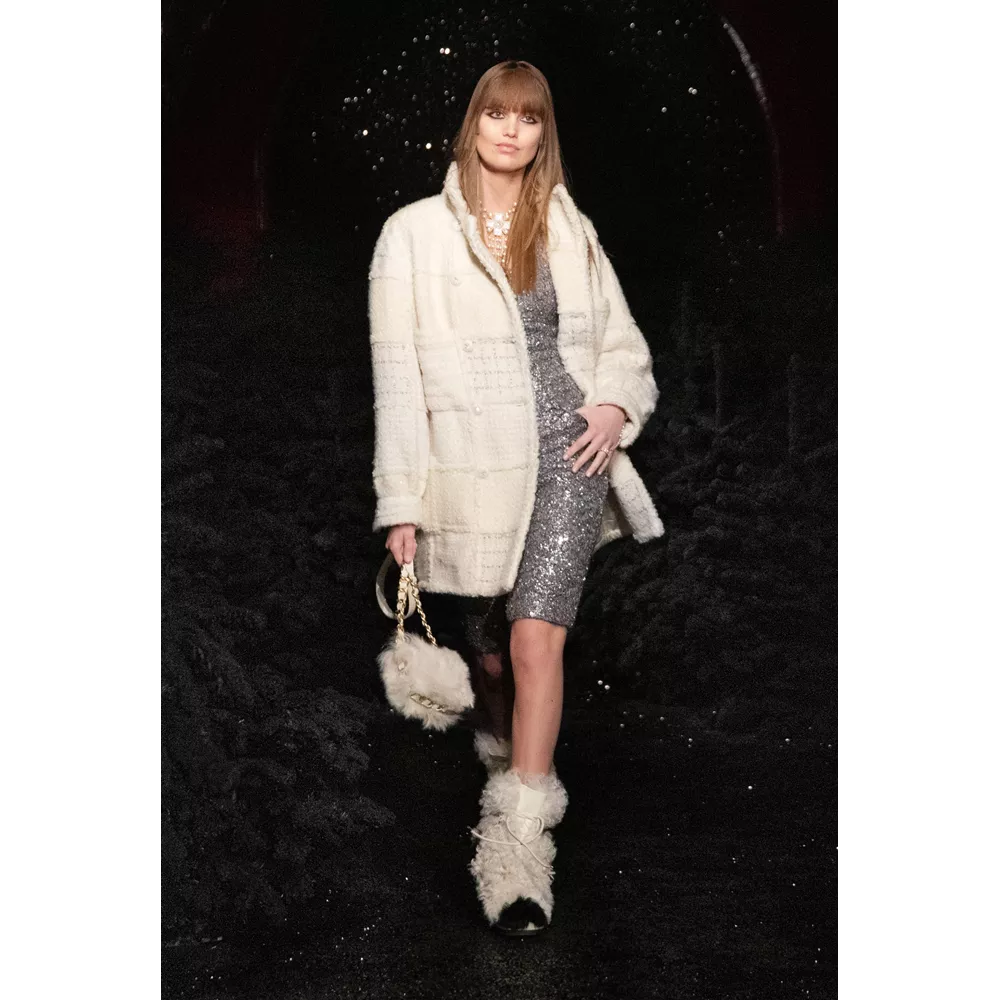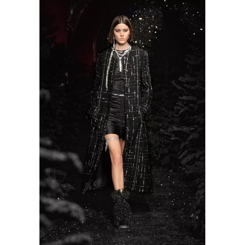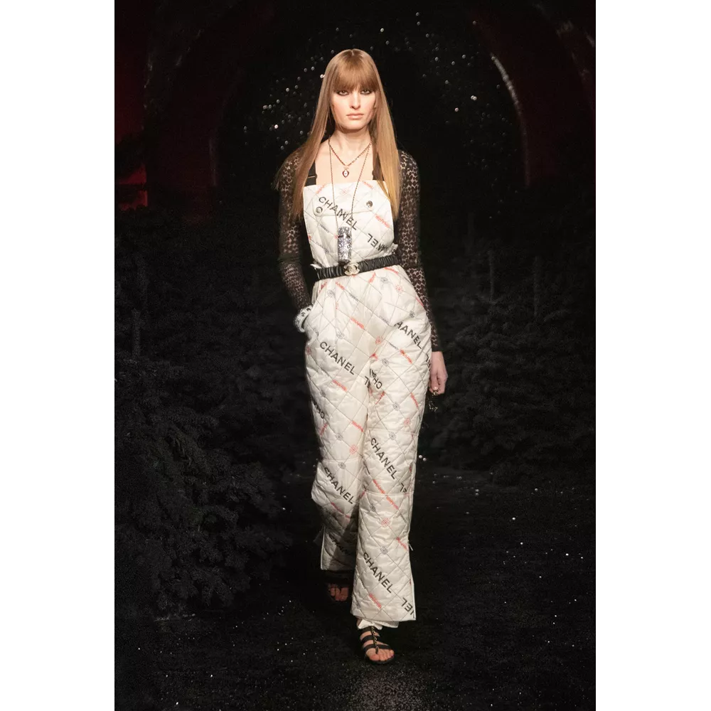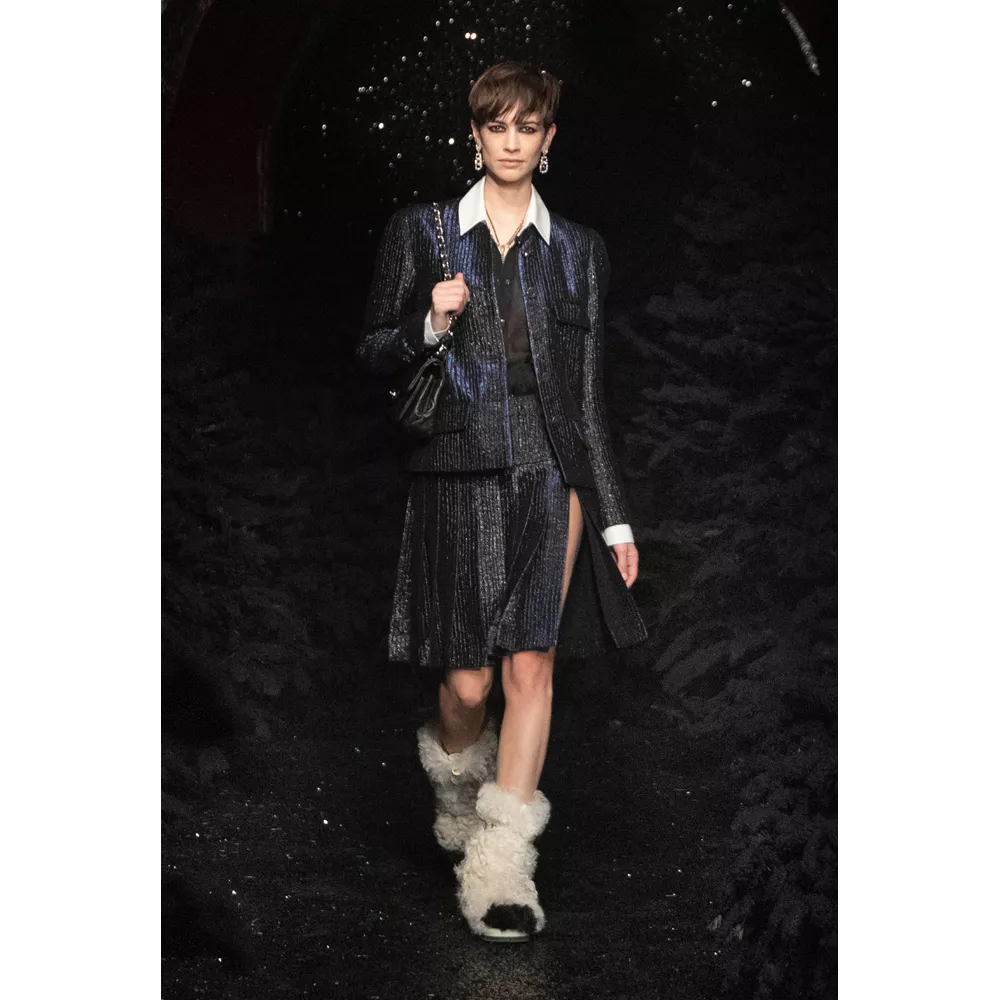 Η συλλογή της Virginie Viard βασίζεται στις έντονες αντιθέσεις και το συναρπαστικό layering : οι mixed όγκοι, τα διαφορετικά μοτίβα, τα ανάμεικτα sporty και classy στοιχεία, οι ντελικάτες με τις "βαριές" υφές που συνυπάρχουν στα σύνολα, όλα οδηγούν σε μία κυρίαρχη αισθητική που κάνει το σικ προσιτό όσο την πολυτέλεια. Η cool αυτοπεποίθηση που αποπνέουν τα μοντέλα της Chanel ντυμένα με τις δημιουργίες του Φθινοπώρου 2021, είναι η απόρροια μίας συνύπαρξης ανάμεσα σε όλα εκείνα τα στοιχεία στο ντύσιμο, αυστηρά και χαλαρά, που θα μπορούσαν να ευχαριστήσουν μία γυναίκα: οι après ski boots που εμφανίζονται σε πολλά από τα looks της συλλογής συνδυάζονται με εφαρμοστά μίνι φορέματα και faux πέρλες, pencil φούστες και κοστούμια, φορέματα -διαφάνειες και hot pants ξεχωρίζουν μέσα από loose fit παλτό και καμπαρντίνες, puffer μπουφάν αποκτούν λαμπερές λεπτομέρειες και συνδυάζονται με διαφανείς πουκαμίσες, τουίντ κοστούμια προτείνονται φορεμένα με σέξι bodysuits, κλασικά ταγιέρ εμφανίζονται με αυθάδη σκισίματα στο πλάι και συνδυάζονται με leather shearling πανωφόρια και faux fur μπότες, ενώ οι καπιτονέ σαλοπέτες του σκι προσφέρουν το τέλειο κοντράστ συνδυασμένες με φλατ πέδιλα.