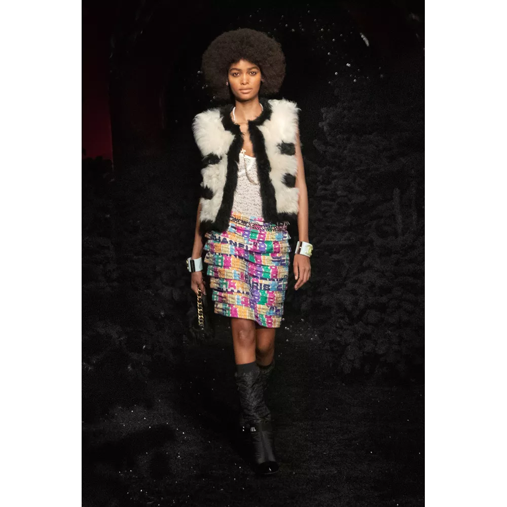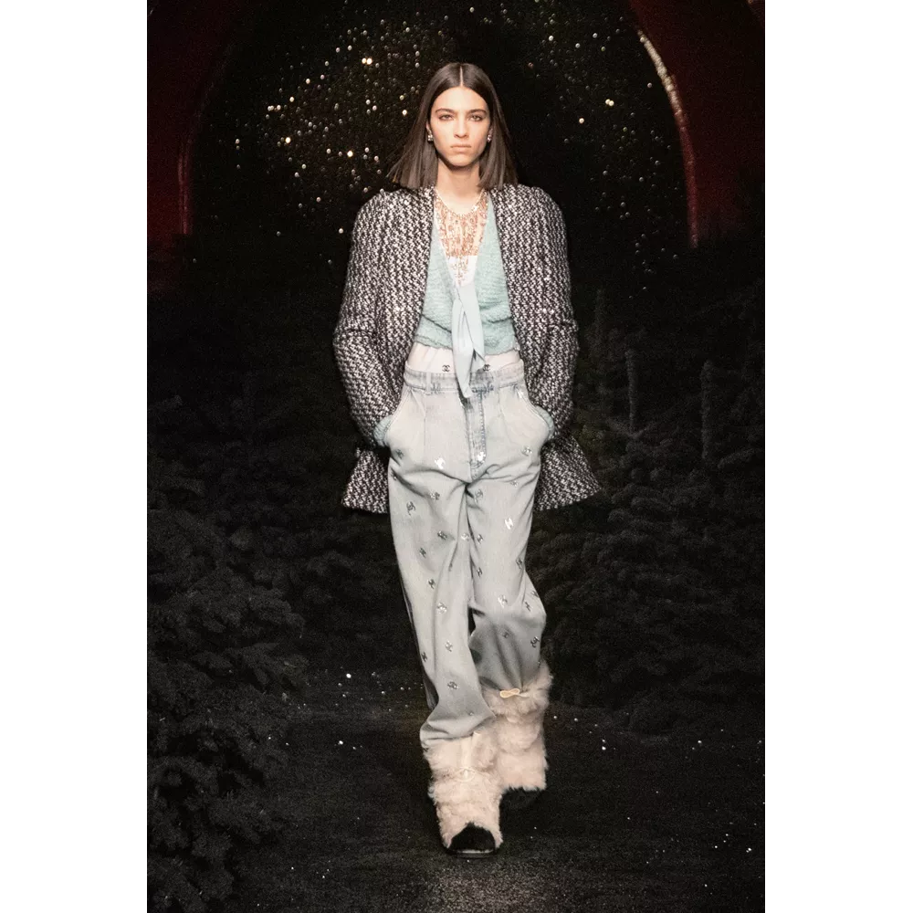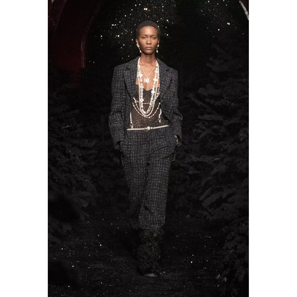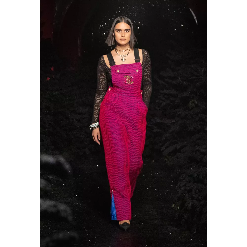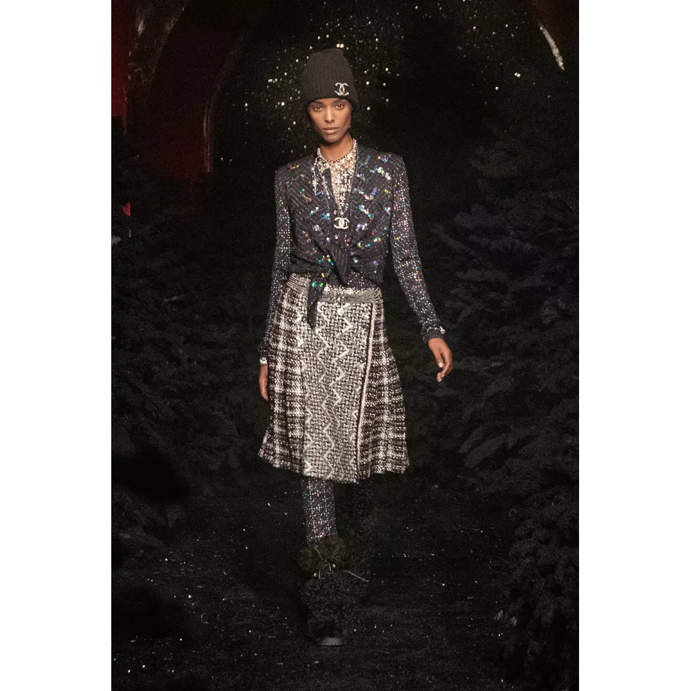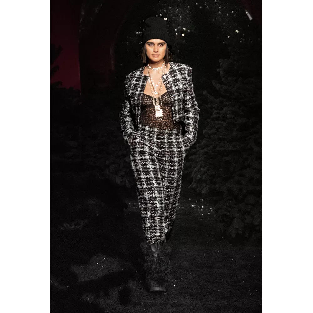 Η συλλογή της Virginie Viard βασίζεται στις έντονες αντιθέσεις και το συναρπαστικό layering : οι mixed όγκοι, τα διαφορετικά μοτίβα, τα ανάμεικτα sporty και classy στοιχεία, οι ντελικάτες με τις "βαριές" υφές που συνυπάρχουν στα σύνολα, όλα οδηγούν σε μία κυρίαρχη αισθητική που κάνει το σικ προσιτό όσο την πολυτέλεια. Η cool αυτοπεποίθηση που αποπνέουν τα μοντέλα της Chanel ντυμένα με τις δημιουργίες του Φθινοπώρου 2021, είναι η απόρροια μίας συνύπαρξης ανάμεσα σε όλα εκείνα τα στοιχεία στο ντύσιμο, αυστηρά και χαλαρά, που θα μπορούσαν να ευχαριστήσουν μία γυναίκα: οι après ski boots που εμφανίζονται σε πολλά από τα looks της συλλογής συνδυάζονται με εφαρμοστά μίνι φορέματα και faux πέρλες, pencil φούστες και κοστούμια, φορέματα -διαφάνειες και hot pants ξεχωρίζουν μέσα από loose fit παλτό και καμπαρντίνες, puffer μπουφάν αποκτούν λαμπερές λεπτομέρειες και συνδυάζονται με διαφανείς πουκαμίσες, τουίντ κοστούμια προτείνονται φορεμένα με σέξι bodysuits, κλασικά ταγιέρ εμφανίζονται με αυθάδη σκισίματα στο πλάι και συνδυάζονται με leather shearling πανωφόρια και faux fur μπότες, ενώ οι καπιτονέ σαλοπέτες του σκι προσφέρουν το τέλειο κοντράστ συνδυασμένες με φλατ πέδιλα.