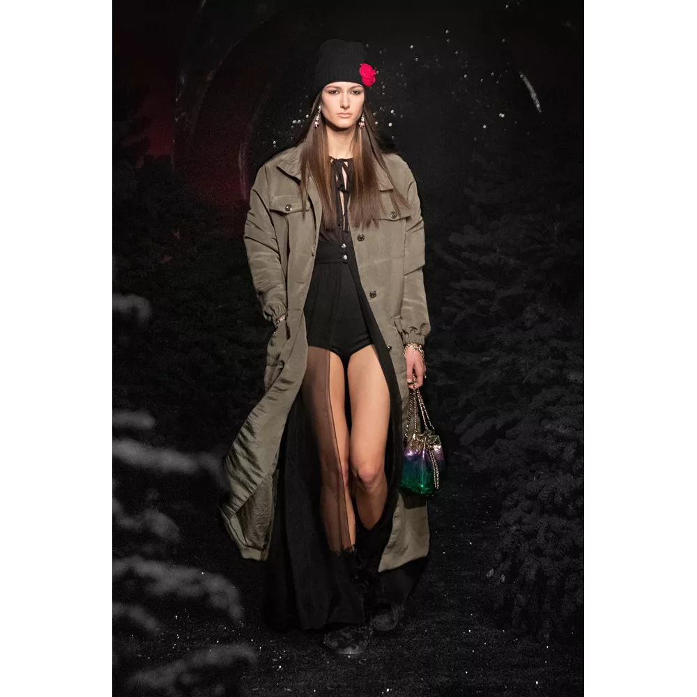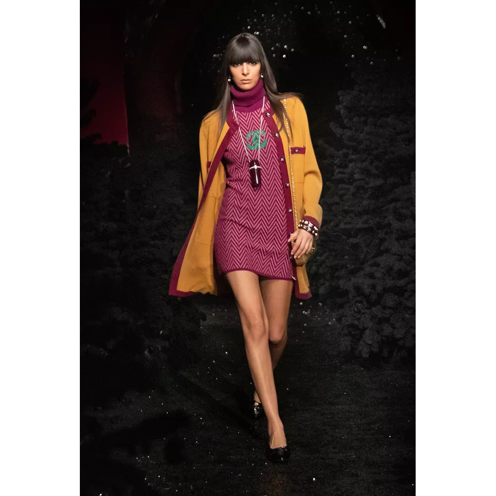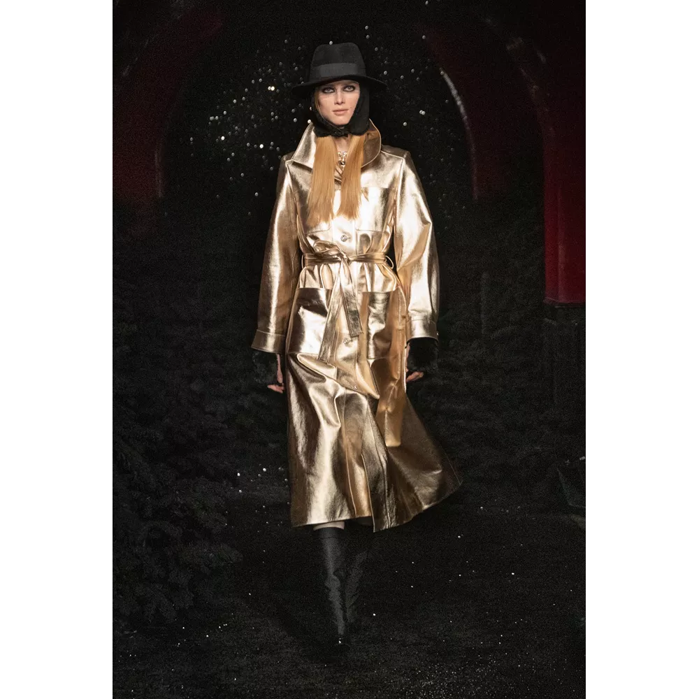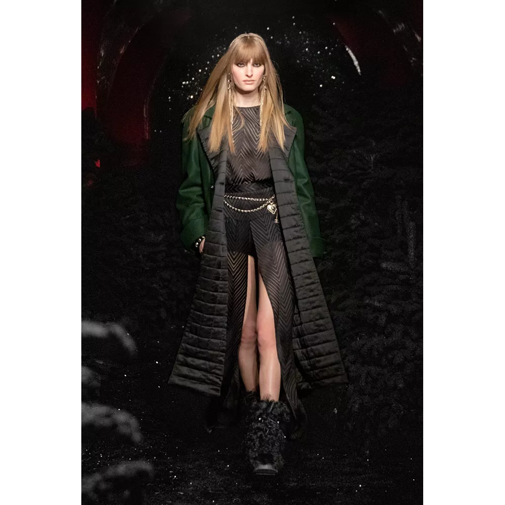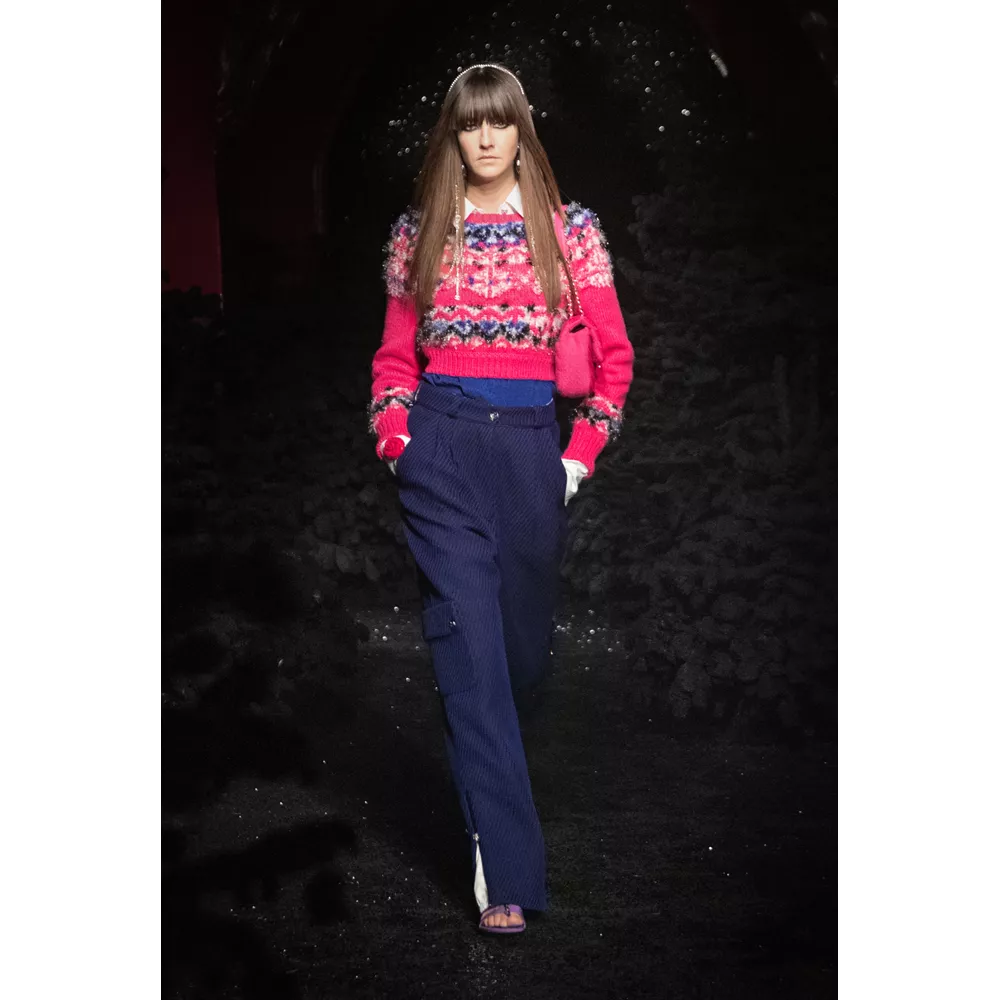 Η συλλογή της Virginie Viard βασίζεται στις έντονες αντιθέσεις και το συναρπαστικό layering : οι mixed όγκοι, τα διαφορετικά μοτίβα, τα ανάμεικτα sporty και classy στοιχεία, οι ντελικάτες με τις "βαριές" υφές που συνυπάρχουν στα σύνολα, όλα οδηγούν σε μία κυρίαρχη αισθητική που κάνει το σικ προσιτό όσο την πολυτέλεια. Η cool αυτοπεποίθηση που αποπνέουν τα μοντέλα της Chanel ντυμένα με τις δημιουργίες του Φθινοπώρου 2021, είναι η απόρροια μίας συνύπαρξης ανάμεσα σε όλα εκείνα τα στοιχεία στο ντύσιμο, αυστηρά και χαλαρά, που θα μπορούσαν να ευχαριστήσουν μία γυναίκα: οι après ski boots που εμφανίζονται σε πολλά από τα looks της συλλογής συνδυάζονται με εφαρμοστά μίνι φορέματα και faux πέρλες, pencil φούστες και κοστούμια, φορέματα -διαφάνειες και hot pants ξεχωρίζουν μέσα από loose fit παλτό και καμπαρντίνες, puffer μπουφάν αποκτούν λαμπερές λεπτομέρειες και συνδυάζονται με διαφανείς πουκαμίσες, τουίντ κοστούμια προτείνονται φορεμένα με σέξι bodysuits, κλασικά ταγιέρ εμφανίζονται με αυθάδη σκισίματα στο πλάι και συνδυάζονται με leather shearling πανωφόρια και faux fur μπότες, ενώ οι καπιτονέ σαλοπέτες του σκι προσφέρουν το τέλειο κοντράστ συνδυασμένες με φλατ πέδιλα.
