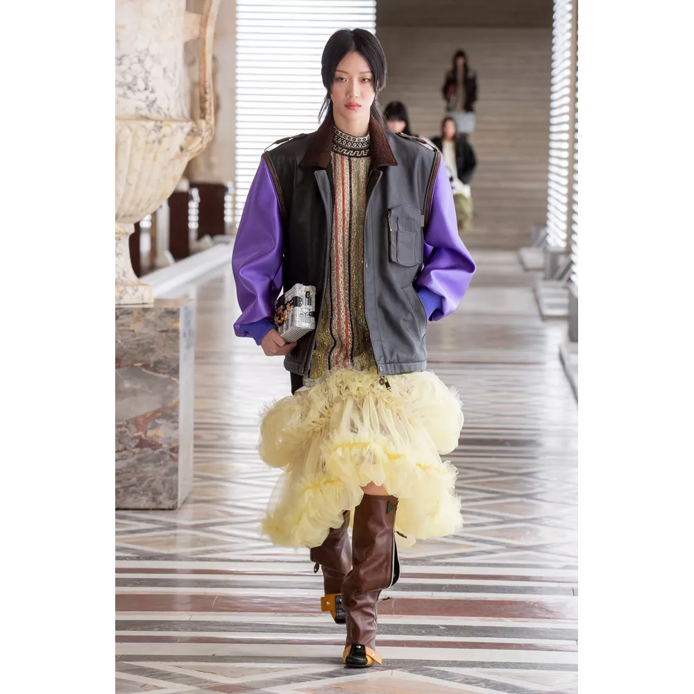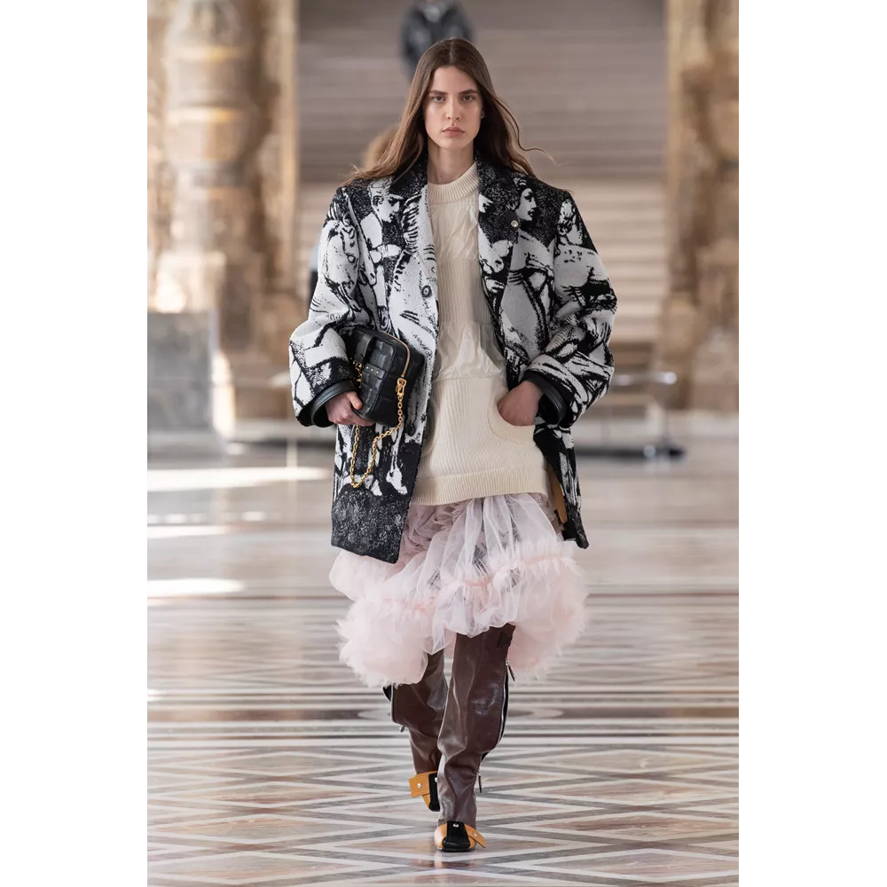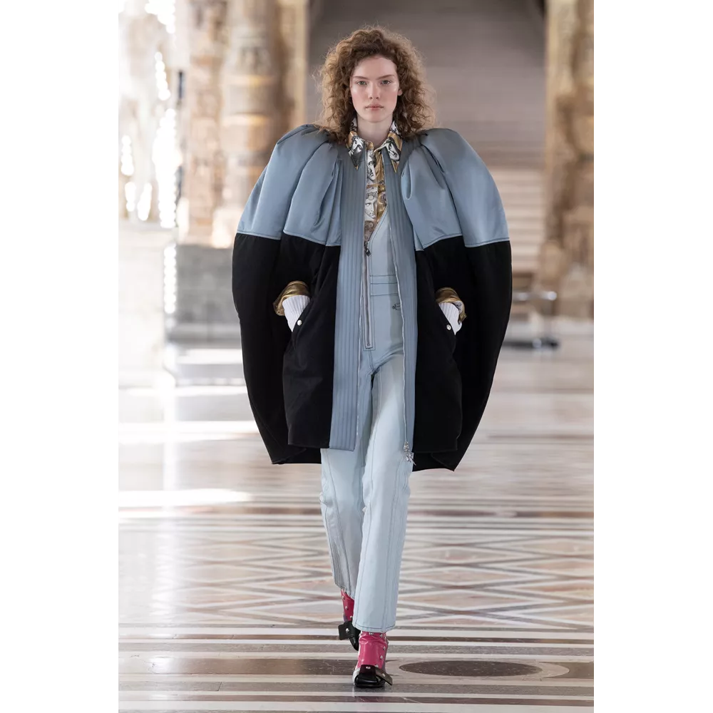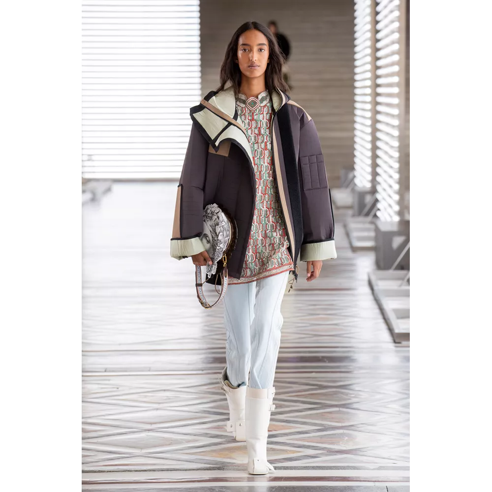 Οι αντιθέσεις ανάμεσα σε λαμπερά, ντελικάτα και relaxed, sporty και ογκώδη κομμάτια είναι εμφανείς στην FW21 collection, με τον Ghesquière να έχει την επιπλέον ευφυΐα να μην περιοριστεί με τις δημιουργίες τους μόνο στο "πάντρεμα" του comfy και loose με το glam και το chic ή το punk. Ο Ghesquière επενδύει σε σχέδια και σιλουέτες που ξεχωρίζουν και γίνονται μοναδικές, όπως τα oversized πανωφόρια που μοιάζουν με κουκούλια ή τις ιδιαίτερες balloon φούστες από πιο "καθημερινά" υφάσματα, αλλά και σε υφάσματα, όπως το fleece, που μπορεί να μοιάζει ταπεινό σε σχέση με τα λαμπερά sequin με τα οποία συνδυάζεται ή τα δερμάτινα της συλλογής, ωστόσο αποκτά high fashion οντότητα, από τον τρόπο με τον οποίο είναι δουλεμένο.