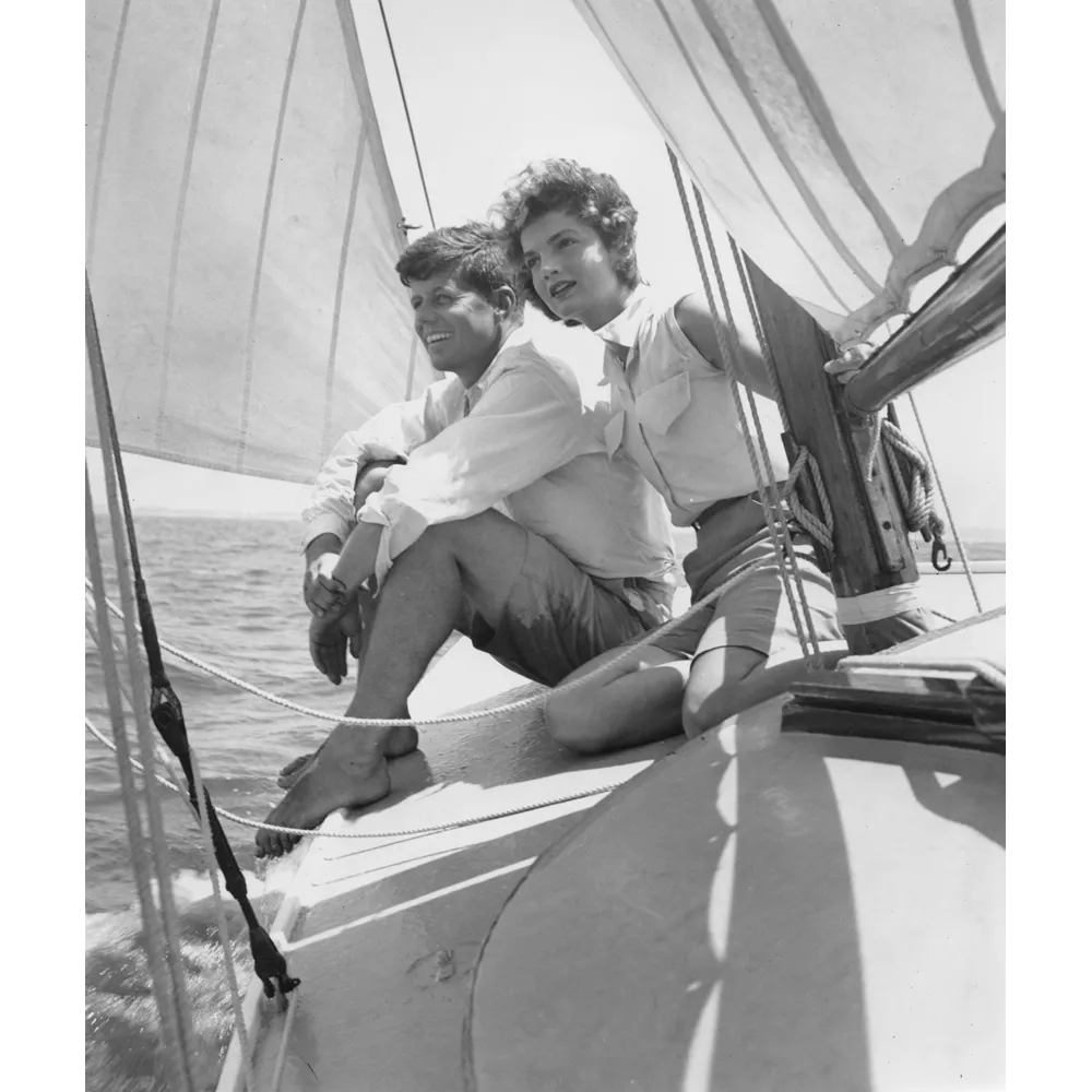 1953: Με τον αρραβωνιαστικό της τότε, γερουσιαστή John F. Kennedy, σε ιστιοπλοϊα στο Hyannis Port. Η Jackie φοράει βερμούδα και αμάνικο τοπ με τσέπες.