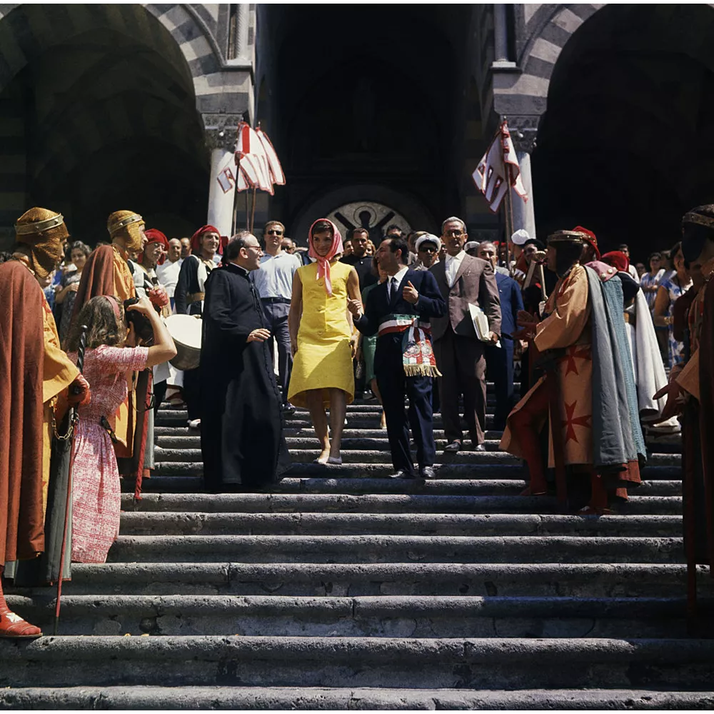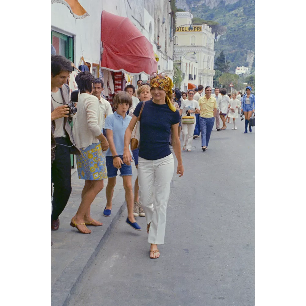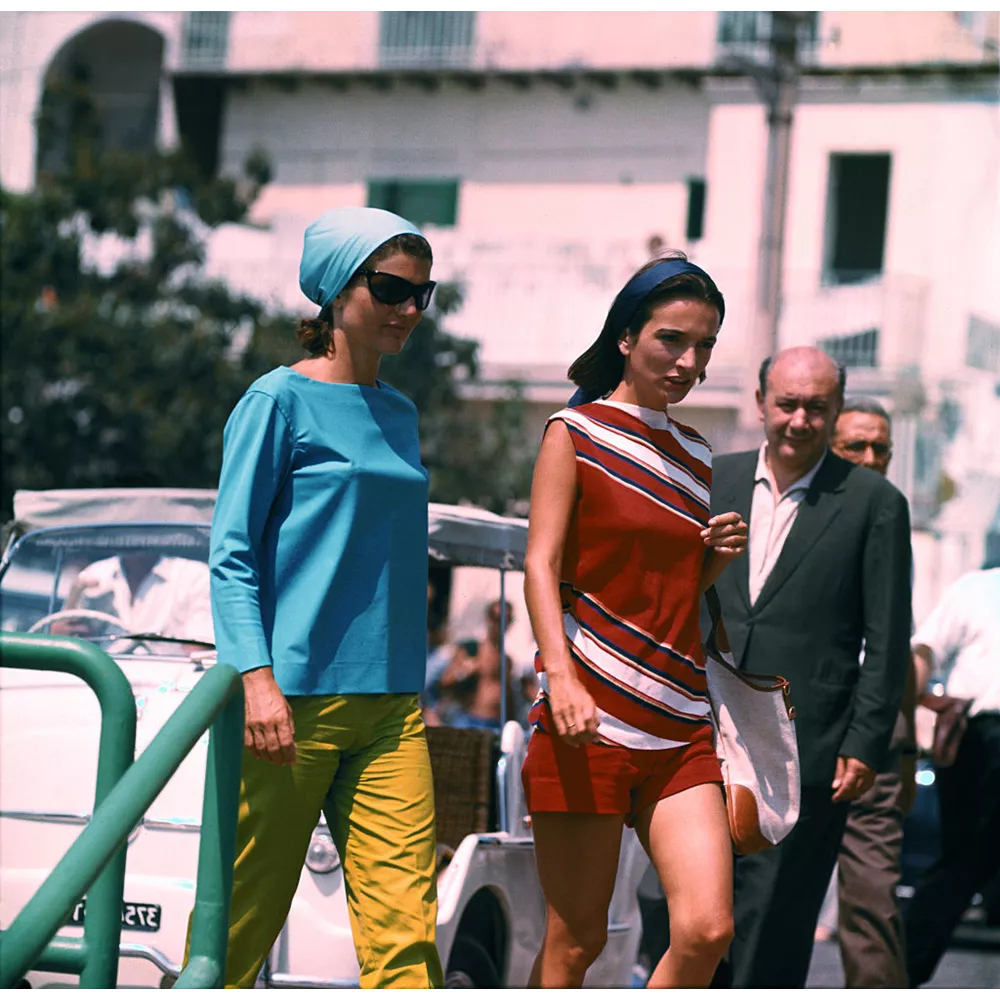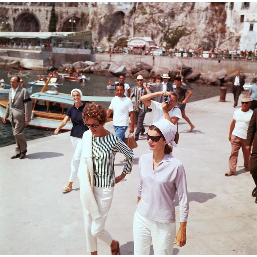 Σε διακοπές στο Amalfi με τη φίλη της, Marella Agnelli - σύζυγο του μεγαλομετόχου και Προέδρου της FIAT, Gianni Agnelli. Η Jackie έχει βασίσει το σύνολό της στα αγαπημένα της κομμάτια: λευκό κάπρι παντελόνι και μαντήλι στα μαλλιά.