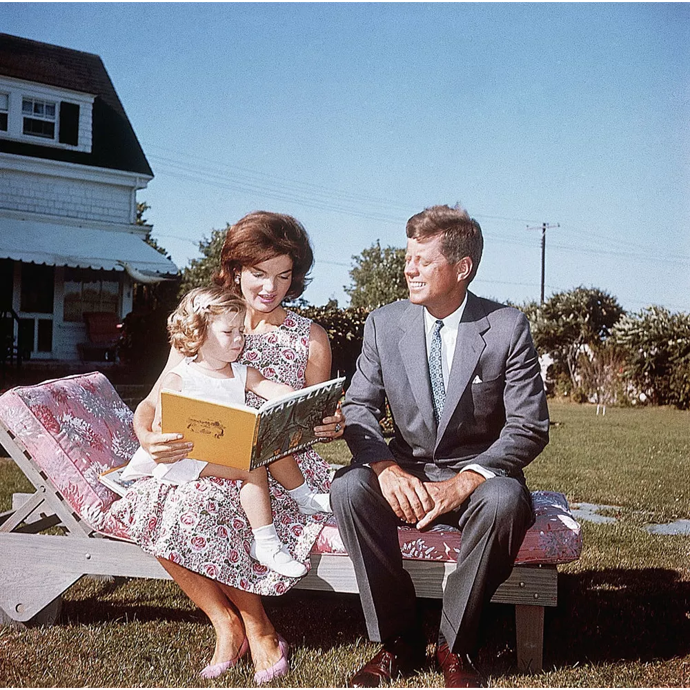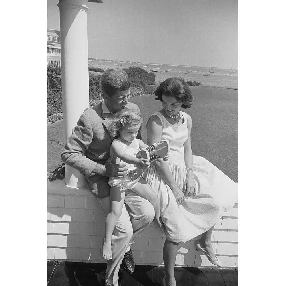 1960: Με τον σύζυγό της και την κόρη τους Caroline, στο Cape Cod της Μασαχουσέτης. Η Jackie φοράει ένα φόρεμα σε vichy καρό.