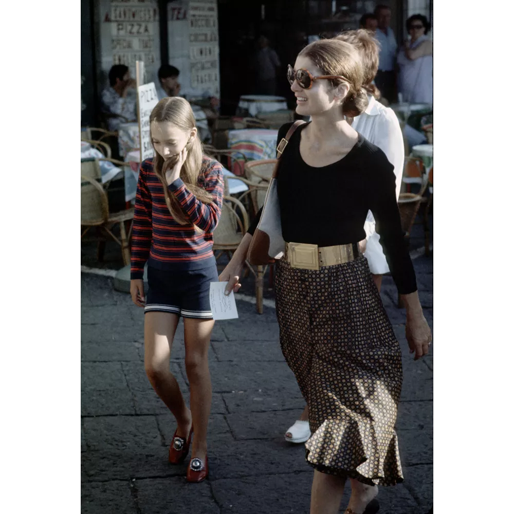 1970: Με την ανηψιά της, Tina, στο Κάπρι της Ιταλίας, σε διακοπές με την οικογένειά της. Η Jackie κρατά τη αγαπημένη της hobo bag του οίκου Gucci που αργότερα πήρε το όνομά της.