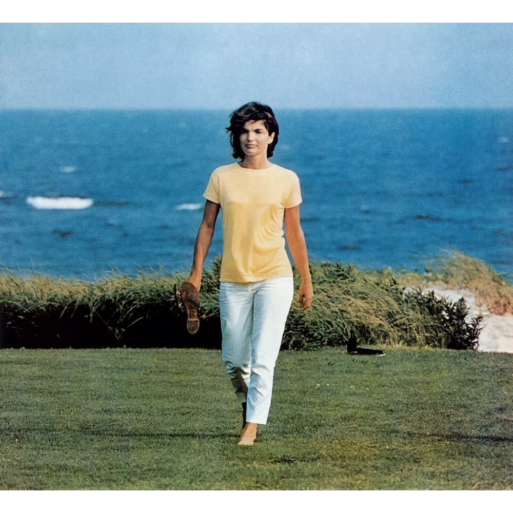 Η Jackie στο Hyannis Port το 1964 λίγο μετά τη δολοφονία του συζύγου της. Έχει ντυθεί απλά μ' ένα λευκό cropped παντελόνι και t-shirt στο αγαπημένο της χρώμα, το κίτρινο.